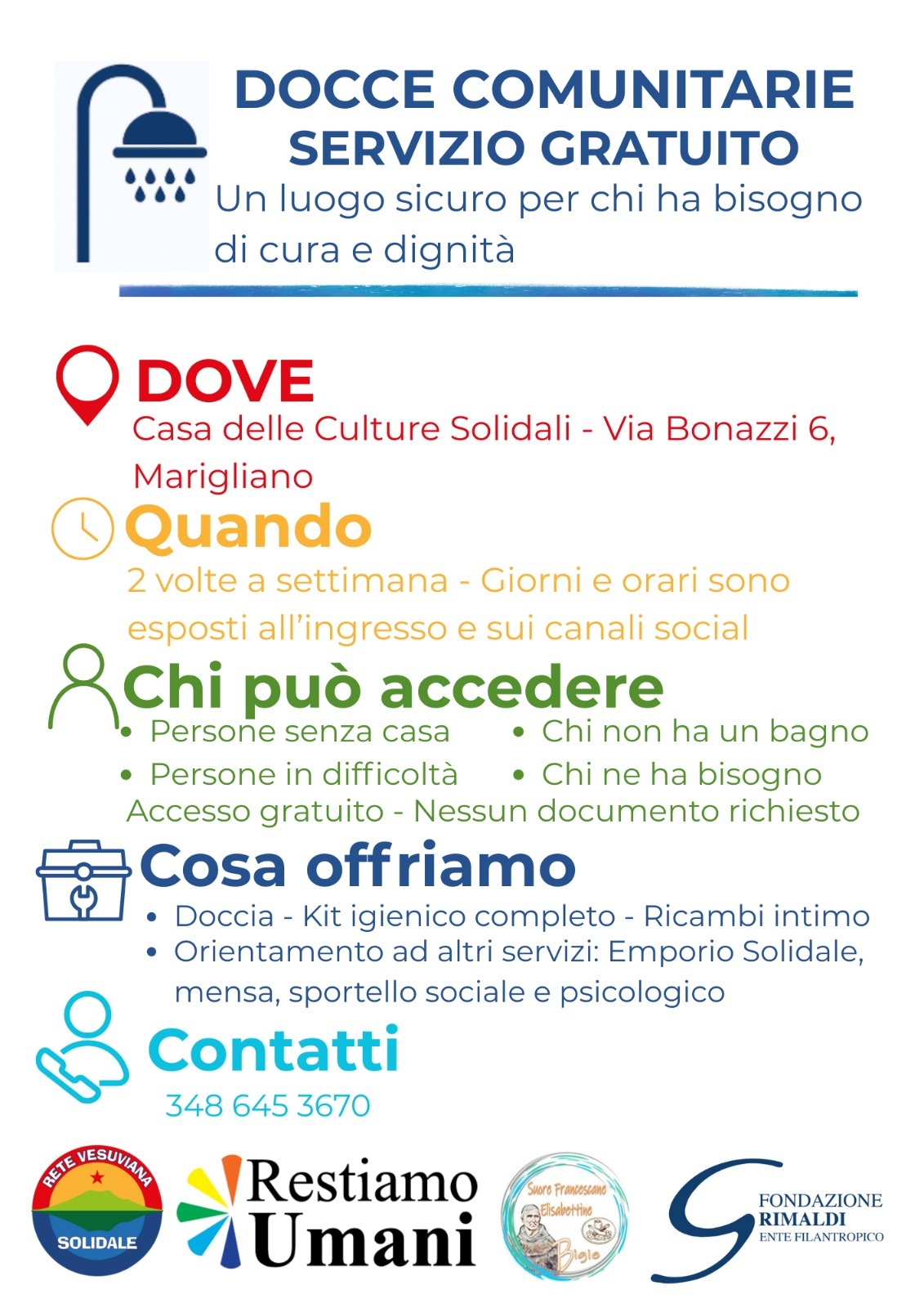 Le docce comunitarie saranno disponibili insieme a un kit igienico completo e intimo di ricambio, come gesto concreto di accoglienza dignitosa, nel rispetto delle persone e della loro riservatezza.