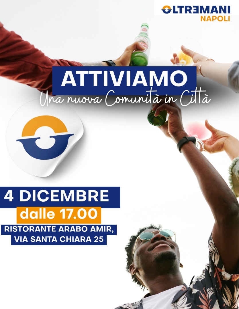 Attivare umanità con gesti concreti di accoglienza, inclusione e cittadinanza attiva. È questo il cuore dell’iniziativa promossa da OLTREMANI NAPOLI, nuova realtà del terzo settore che si presenta ufficialmente al territorio con l’evento “ATTIVIAMO – Una nuova Comunità in Città”, in programma il 4 dicembre dalle ore 17.00 presso il Ristorante Arabo Amir, in via Santa Chiara 25 a Napoli.