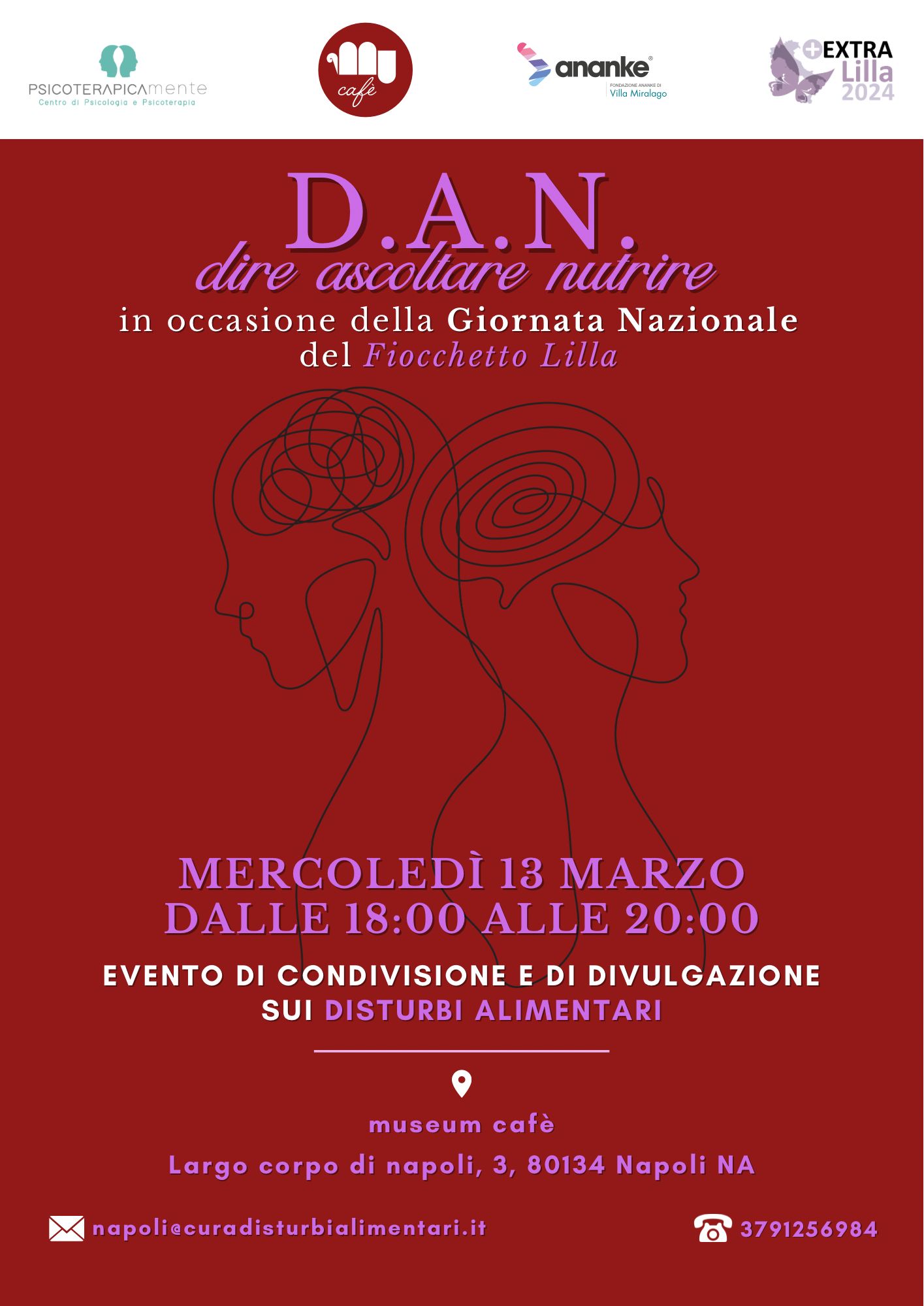Il 13 marzo, in occasione della Giornata Nazionale del Fiocchetto Lilla – in programma il 15 marzo – dalle ore 18 alle ore 20, si terrà al Museum Cafè di Napoli, l’evento “DAN – dire, ascoltare, nutrire”.