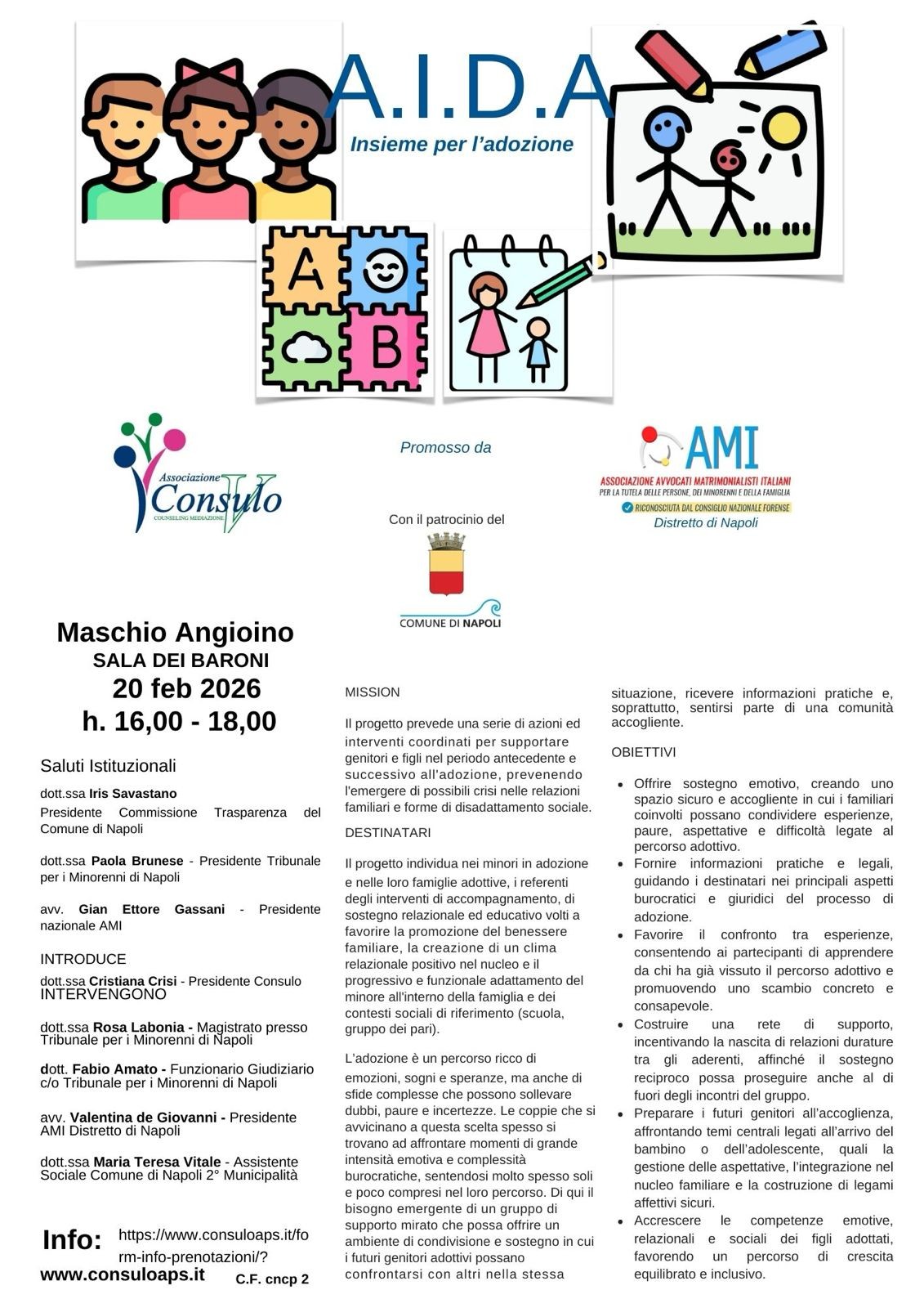 L’iniziativa sarà presentata venerdì 20 Febbraio 2026 alle ore 16 presso la Sala dei Baroni del Maschio Angioino, in occasione di un convegno accreditato presso il Coordinamento nazionale counselor professionisti (vale 2 crediti formativi). Dopo i saluti istituzionali di Iris Savastano, presidente della Commissione Trasparenza del Comune di Napoli, Paola Brunese presidente del Tribunale per i Minorenni di Napoli; Gian Ettore Gassani presidente nazionale dell’Ami – Avvocati Matrimonialisti Italiani e l’introduzione di Cristiana Crisi, presidente dell’associazione Consulo e presidente nazionale dell’Aims – Associazione Internazionale Mediatori Sistemici, interverranno: Rosa Labonia magistrato presso il Tribunale per i Minorenni di Napoli; Fabio Amato funzionario presso il Tribunale per i Minorenni di Napoli; Valentina de Giovanni presidente Ami – Distretto di Napoli e vicepresidente nazionale; Maria Teresa Vitale assistente sociale presso la Seconda Municipalità del Comune di Napoli.