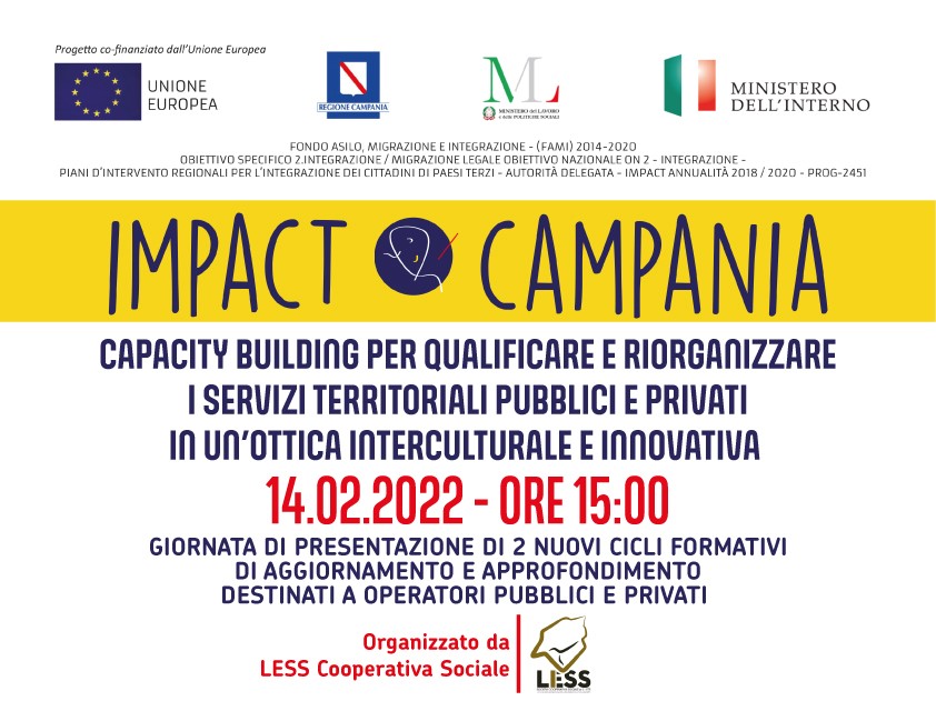 Per ulteriori informazioni è possibile scrivere a info@lessimpresasociale.it oppure a segreteria@pja2001.eu. I percorsi formativi sono organizzati nell’ambito del progetto IMPACT CAMPANIA il cui obiettivo è la realizzazione di piani di intervento regionali per l’integrazione dei cittadini di paesi terzi e la costruzione di attività di capacity building con gli Enti locali in materia di procedure a supporto. Il progetto è finanziato dal Fondo Asilo, Migrazione e Integrazione, è capofilato dalla Regione Campania, in partenariato con enti istituzionali e del terzo settore (Anci Campania, Cantiere Giovani Cooperativa Sociale, CIDIS Onlus, Consorzio La Rada, Cooperativa Sociale Credito Senza Confini, Dedalus Cooperativa Sociale, Less Cooperativa sociale, LTM – Gruppo Laici Terzo Mondo, Tertium Millennium Società Società Cooperativa Sociale, Traparentesi Onlus).
