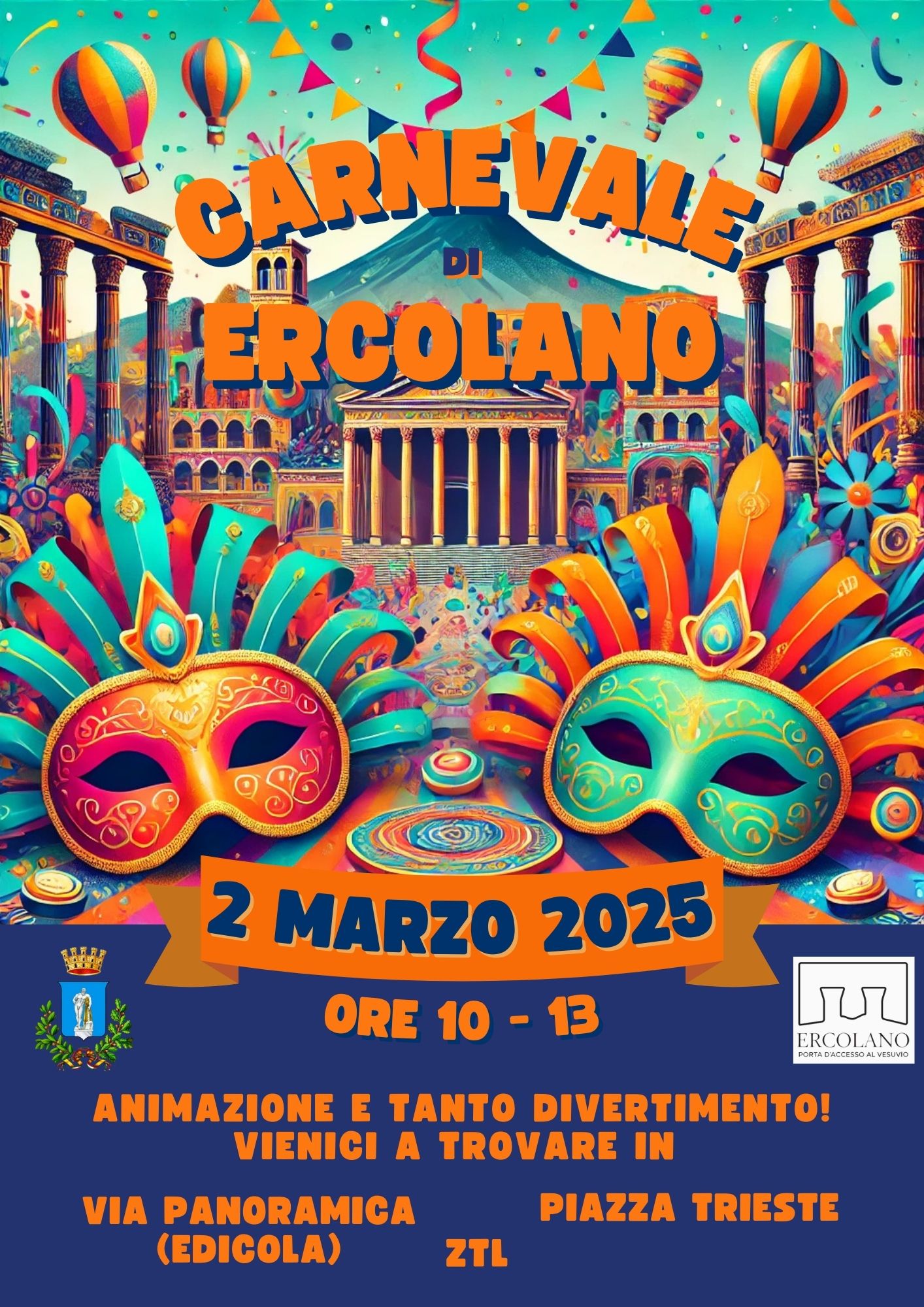 Ercolano si appresta a vivere la magica atmosfera del carnevale. Il cartellone di eventi, organizzato dal Comune prevede tre giorni di festa che cominceranno domenica 2 marzo, con una mattinata di animazione in tre punti nevralgici della città (Via Panoramica, piazza Trieste e ZTL), per concludersi l’8 marzo, in occasione della festa della Donna, con uno spettacolo teatrale presso il MAV, messo in scena della compagnia Ritena e incentrato sulla figura della donna nella storia.