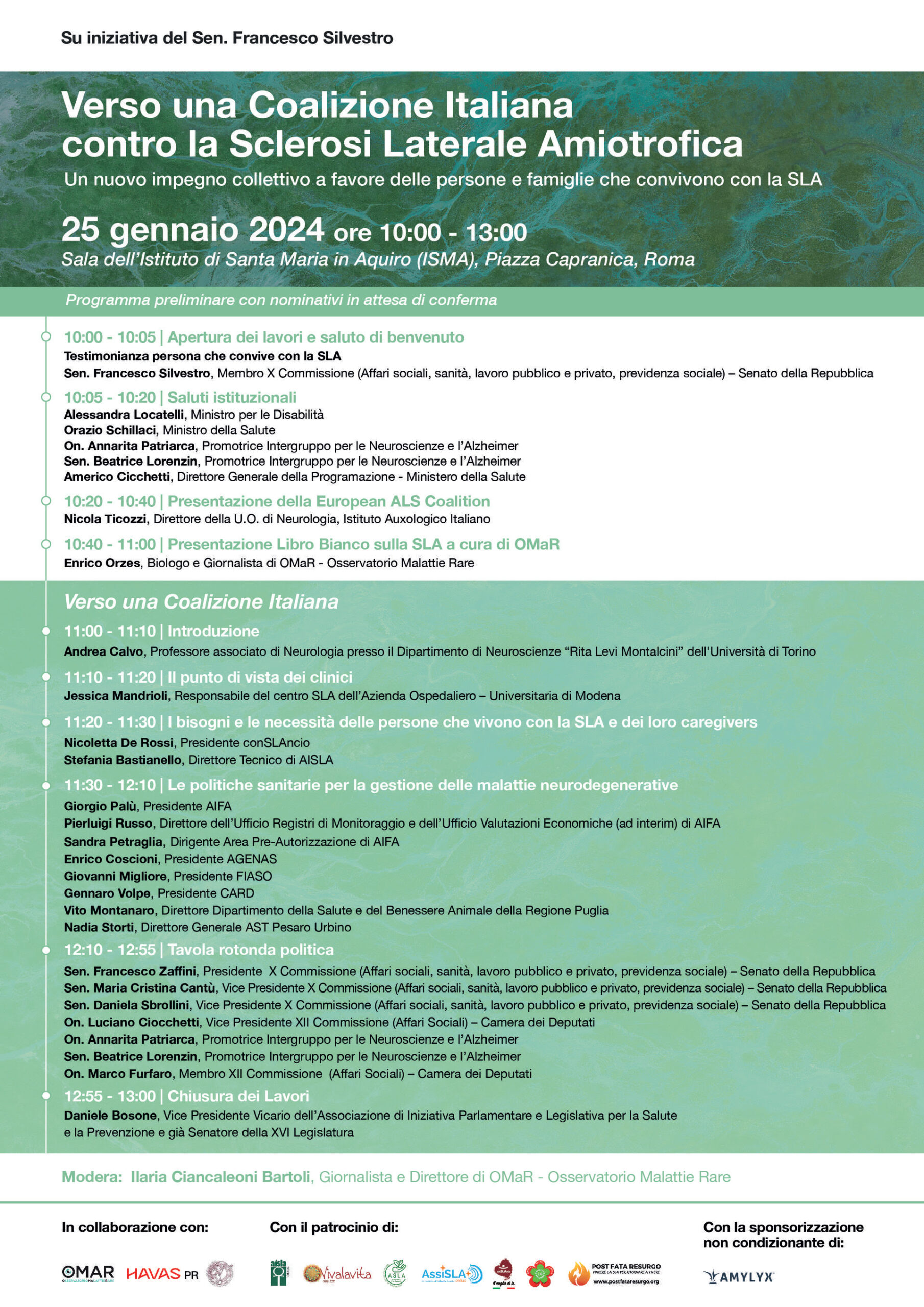 Il tema delle malattie neurodegenerative, come la SLA, rappresenta una delle grandi sfide per la nostra società dal punto di visto scientifico, sociale, economico e politico: a livello Europeo, la nascita della EU ALS Coalition rappresenta un forte segnale di presa in carico di questa sfida, che può essere opportunamente declinato alle specificità e ai bisogni dello scenario socio-sanitario italiano. Al fine di stimolare una discussione tra Istituzioni, comunità scientifica e Associazioni Pazienti di riferimento, nasce l’idea di questo convegno dedicato alla creazione di una coalizione italiana che si faccia carico di trovare soluzioni condivise e dare una risposta concreta agli unmet needs dei pazienti. L’iniziativa sarà anche l’occasione per presentare in anteprima i risultati dell’importante indagine, intitolata “Sclerosi Laterale Amiotrofica (SLA) – Manifesto sui bisogni clinici insoddisfatti dei malati e delle loro famiglie”, condotta da OMAR – Osservatorio Malattie Rare” sull’attuale situazione relativa alla patologia in Italia.