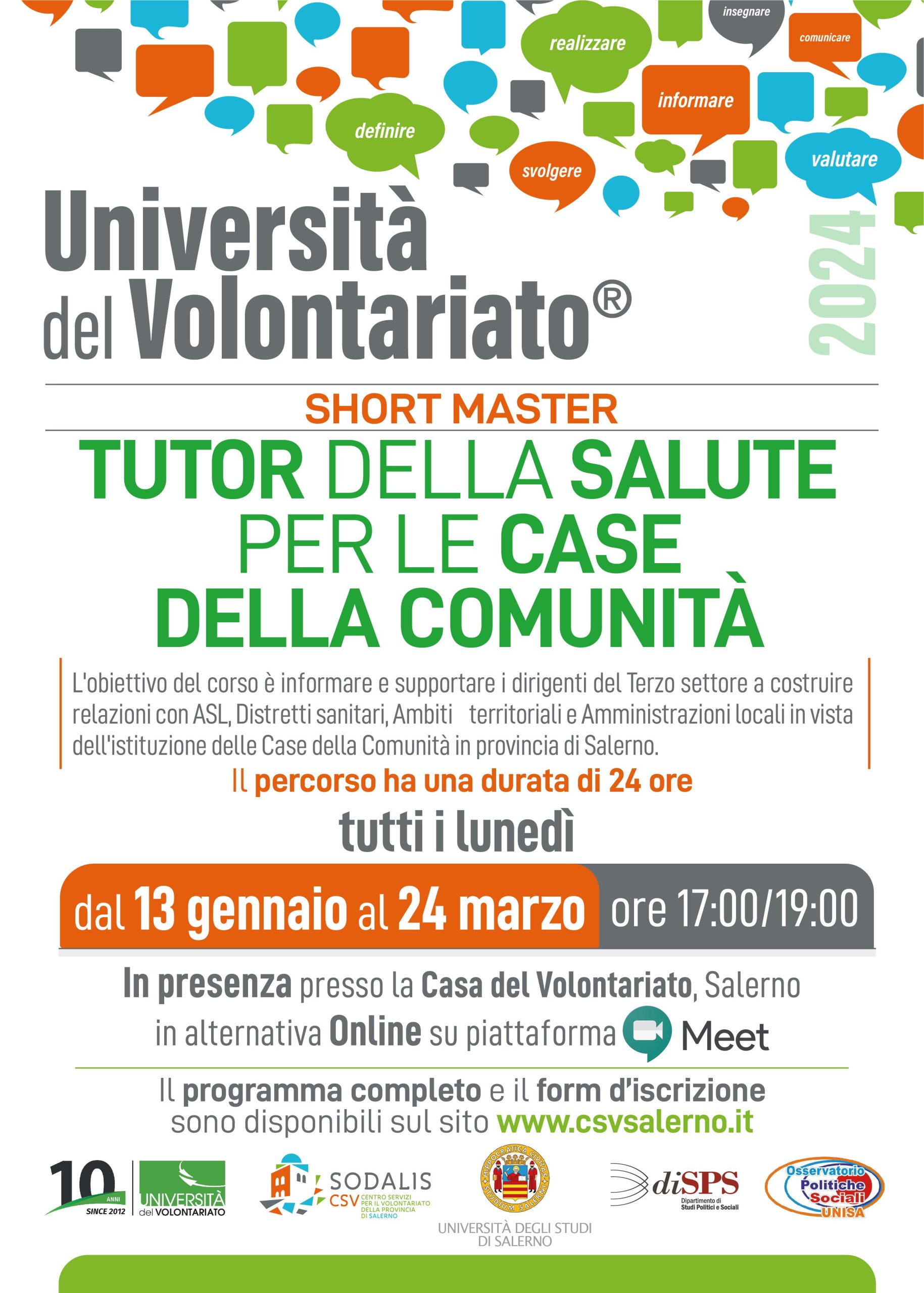 Il corso, patrocinato da ASL Salerno, inizierà il 13 gennaio e terminerà il 31 marzo e si prefigge di avviare tra i volontari del Terzo settore un processo sia culturale che organizzativo per costruire le Case della Comunità in accordo con ASL, distretti sanitari, ambiti territoriali e amministrazioni locali attraverso gli strumenti della co-programmazione e della co-progettazione.