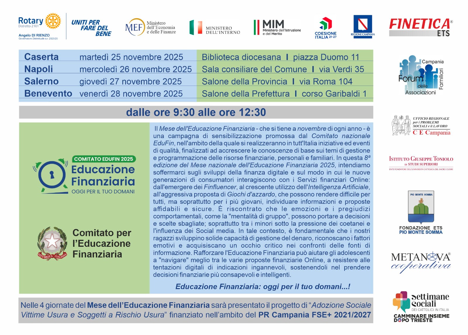 Tutto pronto per l’8ª edizione del Mese dell’Educazione Finanziaria 2025 con un ciclo di quattro giornate dedicate ai temi del risparmio consapevole e della prevenzione delle dipendenze da gioco d’azzardo online.