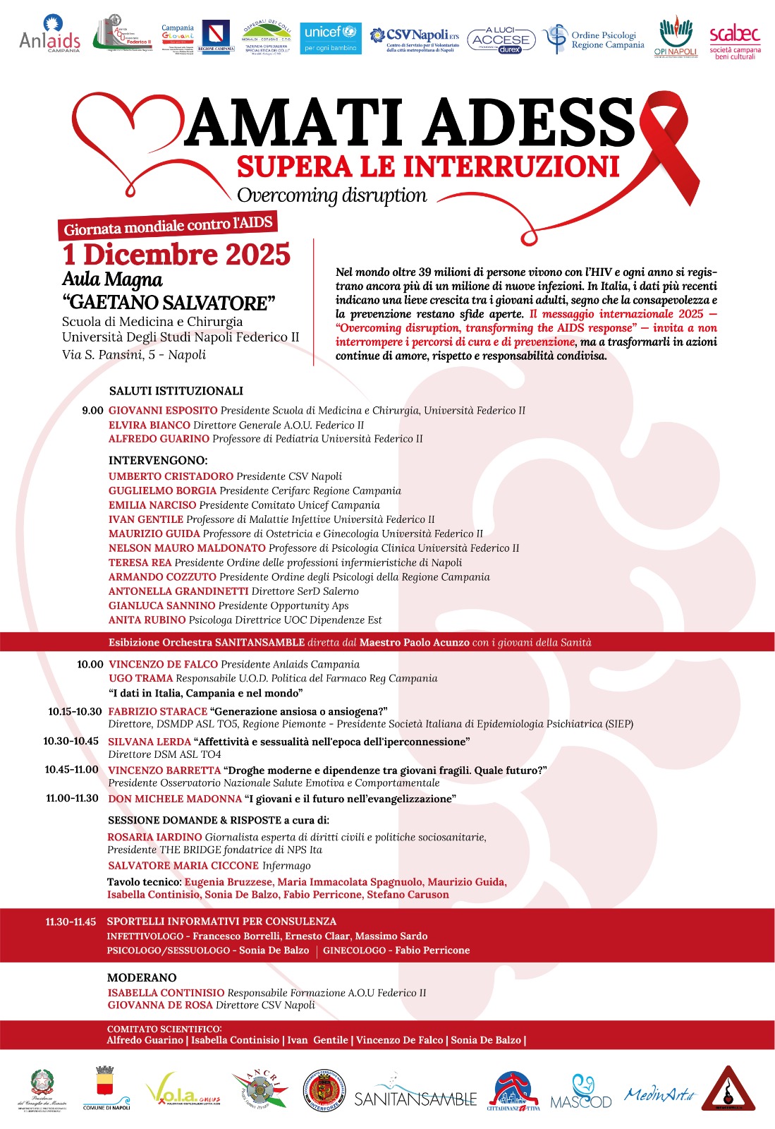 Su iniziativa del professor Alfredo Guarino, della dottoressa Isabella Continisio e del dottor Vincenzo De Falco, prenderà il via il prossimo 1° dicembre 2025, nell’Aula Magna “Gaetano Salvatore” della Scuola di Medicina e Chirurgia dell’Università Federico II, l’edizione 2025 dell’evento dedicato alla Giornata mondiale contro l’AIDS, quest’anno intitolato “Amati adesso. Supera le interruzioni – Overcoming disruption”.
