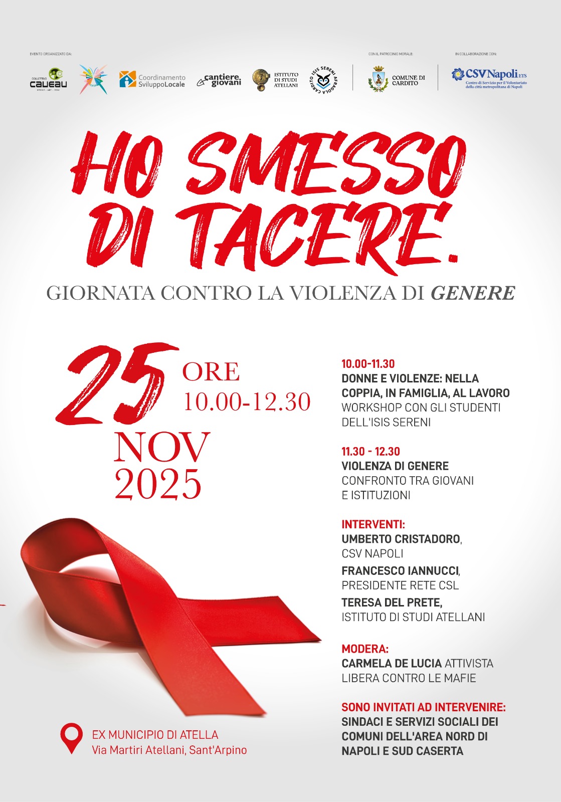 In occasione della Giornata internazionale per l’eliminazione della violenza contro le donne, si terrà lunedì 25 novembre 2025, presso l’ex Municipio di Atella (via Martiri Atellani, Sant’Arpino), l’iniziativa “Ho smesso di tacere”, una mattinata di confronto e sensibilizzazione promossa da Collettivo Caveau, Espera Odv, Coordinamento Sviluppo Locale, Cantiere Giovani e Istituto di Studi Atellani, con il patrocinio del Comune di Cardito e la collaborazione del CSV Napoli.