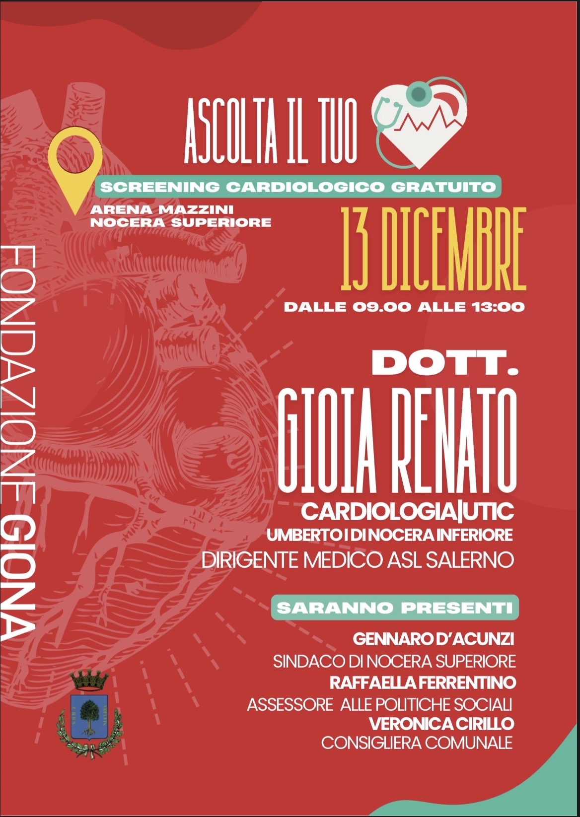 Gli screening saranno effettuati dal dott. Renato Gioia, cardiologo dell’UTIC dell’ospedale Umberto I di Nocera e dirigente medico dell’ASL Salerno, che offrirà professionalità e ascolto a chi spesso non ha possibilità o risorse per accedere con regolarità ai controlli specialistici. La giornata vedrà la presenza del Sindaco di Nocera Superiore dott. Gennaro D’Acunzi, dell’Assessore alle Politiche Sociali, all’Istruzione e all’ Inclusione sociale, avv. Raffaella Ferrentino, e della Consigliera Comunale dott.ssa Veronica Cirillo. Durante gli screening, la Fondazione Giona conferirà al medico Renato Gioia il Premio GIONA, un’opera in ceramica realizzata dal maestro Peppe Cicalese, riconoscimento simbolico attribuito ai professionisti della salute che supportano con