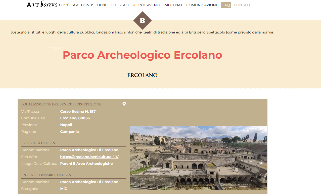 Per l’anno 2025, chi vorrà erogare un contributo per il sito di Ercolano, troverà sul sito Artbonus il titolo: “Sostegno alle attività del Parco Archeologico di Ercolano per l’anno 2025”, l’iniziativa mira a rafforzare le azioni di tutela, valorizzazione, ricerca e fruizione del sito, nell’ottica di una gestione sostenibile e partecipata del patrimonio culturale.
