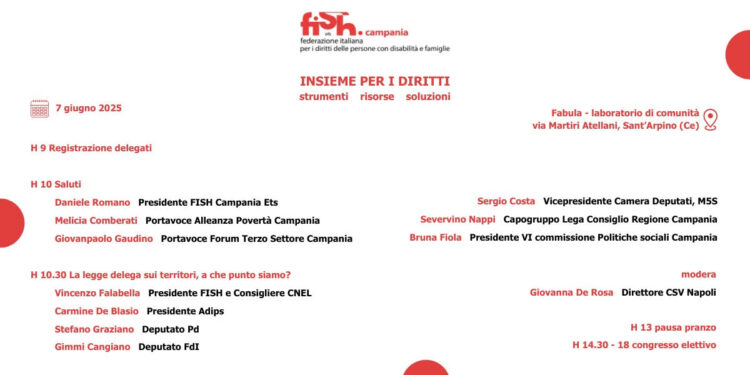 Domani, sabato 7 giugno, avrà luogo il congresso di FISH Campania. Insieme per i diritti. Strumenti, risorse, soluzioni, Questo il titolo della giornata. Un appuntamento cruciale per il mondo associativo e per il territorio, che riunirà rappresentanti istituzionali, esponenti della politica regionale e nazionale, realtà del terzo settore e della società civile. Appuntamento alle 9 presso Fabula – laboratorio di comunità a Sant’Arpino, in provincia di Caserta.