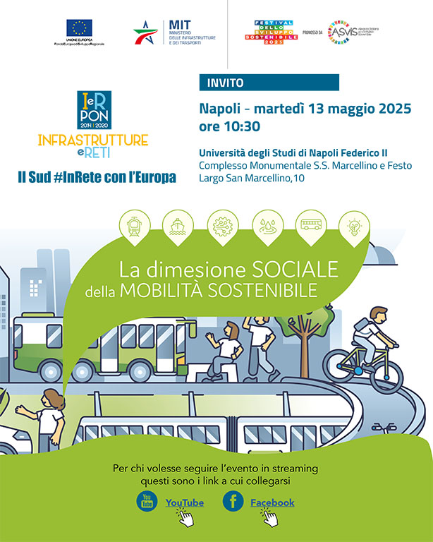 Martedì 13 Maggio, l’Autorità di Gestione del Programma Operativo Nazionale Infrastrutture e Reti 2014-2020 (PON-IR) organizza a Napoli l’incontro: “Il Sud #InRete con l’Europa. La dimensione sociale della mobilità sostenibile“, realizzato nell’ambito del PON Infrastrutture e Reti 2014-2020, per raccontare come le infrastrutture finanziate dai fondi europei stiano trasformando il Sud Italia e costituiscano un importante strumento per l’evoluzione della vita socio-economica e culturale di tutti i cittadini del Mezzogiorno d’Italia nonché una attuazione concreta della trasformazione ecologica e digitale delle infrastrutture locali, territoriali, aeroportuali e marittime. L’evento si terrà a partire dalle ore 10:30 presso l’Università degli Studi di Napoli Federico II, Complesso Monumentale dei Santi Marcellino e Festo (Largo San Marcellino, 10).