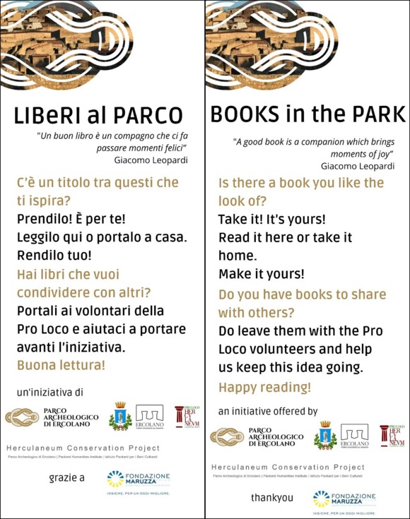 “Il Parco di Ercolano vuole condividere con la comunità sempre più esperienze di vita e culture –interviene il Direttore Sirano – e ad ogni visita vogliamo rendere chi passa del tempo con noi una concreta esperienza di conoscenza. Lo scambio gratuito di libri è qualcosa di più di un dono: è condividere quelle emozioni, interessi, sogni, speranze e timori che ci hanno accompagnato nella lettura. Con questa iniziativa vogliamo anche richiamare una sorta di primogenitura che Ercolano antica ha sempre avuto in questo campo, essendo l’unico sito Romano che abbia sinora restituito una ricca biblioteca di Papiri ritrovata nel 1700 nell’omonima Villa che era peraltro un vero e proprio centro di studio e produzione di testi. Quindi non c’è posto migliore dei nostri splendidi giardini per regalarsi momenti di lettura e per portare con sé un frammento di esperienza e di identità così forti”.