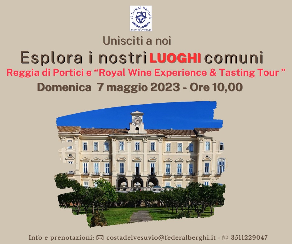 Chi aderisce alla proposta di Federalberghi – Costa del Vesuvio avrà, inoltre, la possibilità di accedere al “Royal Wine Experience & Tasting Tour ”, un caleidoscopio di profumi e sapori legato strettamente alla storia ed alle tradizioni con degustazione di un vino della Campania e taralli salati.