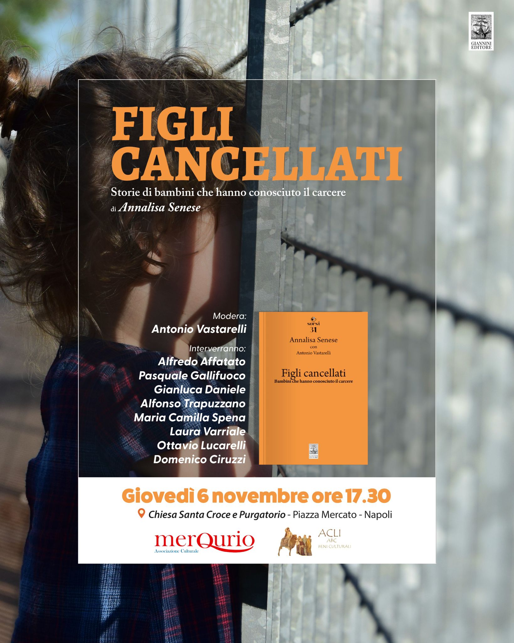 Domani, giovedì 6 novembre, alle ore 17.30, presso la Chiesa di Santa Croce e Purgatorio al Mercato (in Piazza Mercato) si terrà la presentazione del libro di Annalisa Senese “Figli cancellati – Storie di bambini che hanno conosciuto il carcere” (Giannini Editore), organizzato dall’Associazione Culturale Merqurio con Acli Beni Culturali.