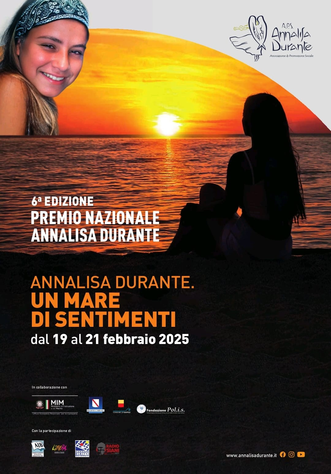 Il Premio Nazionale, per la sesta edizione chiamato “Annalisa Durante. Un mare di sentimenti”, è organizzato dall’Associazione di Promozione Sociale “Annalisa Durante” con la Fondazione Pol.i.s. della Regione Campania, in collaborazione con Regione Campania, Ministero dell’Istruzione e del Merito e Comune di Napoli, con la partecipazione di Aib – Associazione Biblioteche Italiane, Libera – Associazioni, nomi e numeri contro le mafie, il Coordinamento campano dei familiari delle vittime innocenti della criminalità con Radio Siani – La radio della legalità, che garantirà la diretta live degli eventi sulle pagine social dell’APS “Annalisa Durante” e della Fondazione Pol.i.s. L’evento è in programmazione dal 19 al 21 febbraio 2025.