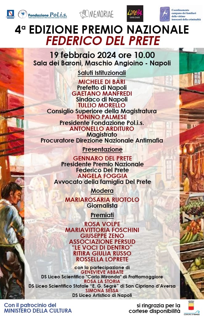Lunedì 19 febbraio, a partire dalle ore 10:00, si terrà presso la Sala dei Baroni del Maschio Angioino di Napoli la Quarta Edizione del “Premio Nazionale Federico Del Prete”, dedicata alla memoria del sindacalista, vittima innocente di camorra, ucciso il 18 febbraio 2002 a Casal di Principe, organizzata dall’Associazione Memoriae, retta da Gennaro Del Prete, figlio di Federico, ideatore, fondatore e presidente del Premio Nazionale, e dalla Fondazione Pol.i.s. della Regione Campania, con l’ausilio di Libera Campania e del Coordinamento campano dei familiari delle vittime innocenti della criminalità. L’iniziativa gode del patrocinio del Ministero della Cultura e della disponibilità del Comune di Napoli.