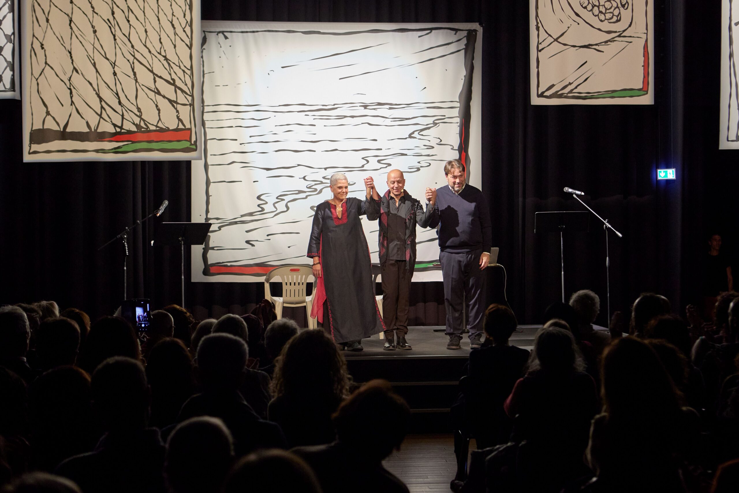 La musica e la voce di Nabil Bey Salameh accompagnano il dialogo come un filo emotivo e culturale che lega suoni, memoria e identità palestinese, mentre i disegni di Marco Sauro, nati all’interno del progetto Ultimo Giorno di Gaza, costruiscono una scena ridotta all’essenziale, capace di evocare più che mostrare. È una drammaturgia della sottrazione, che lascia spazio alla parola e alla responsabilità dello spettatore.
