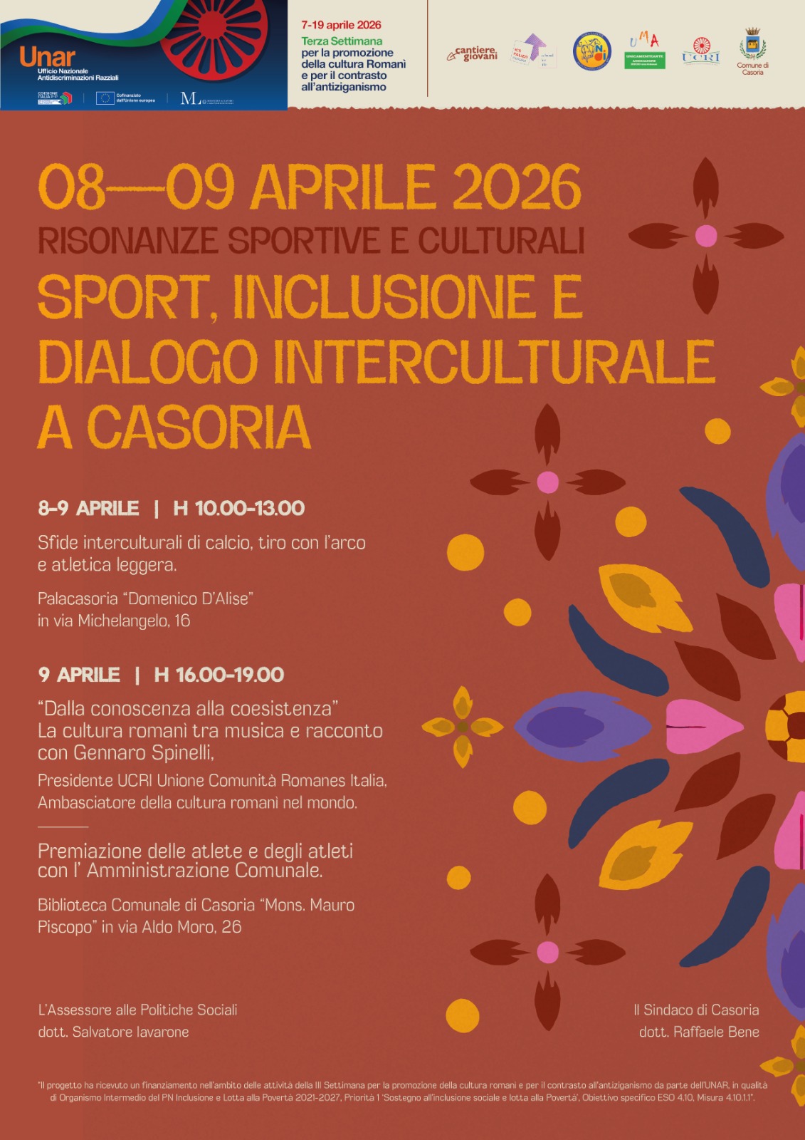 Due giorni di sport, inclusione e dialogo interculturale. L’8 e 9 aprile arriva “Risonanze sportive e culturali – diversità e inclusione con attenzione alle comunità Rom, Sinti, Caminanti”, iniziativa promossa da Cantiere Giovani Cooperativa Sociale Onlus, con il patrocinio del Comune di Casoria, in collaborazione con l’Istituto Comprensivo F. Palizzi, Don Peppino Diana APS, UnicaMente Arte APS e UCRI Unione Comunità Romanés in Italia.