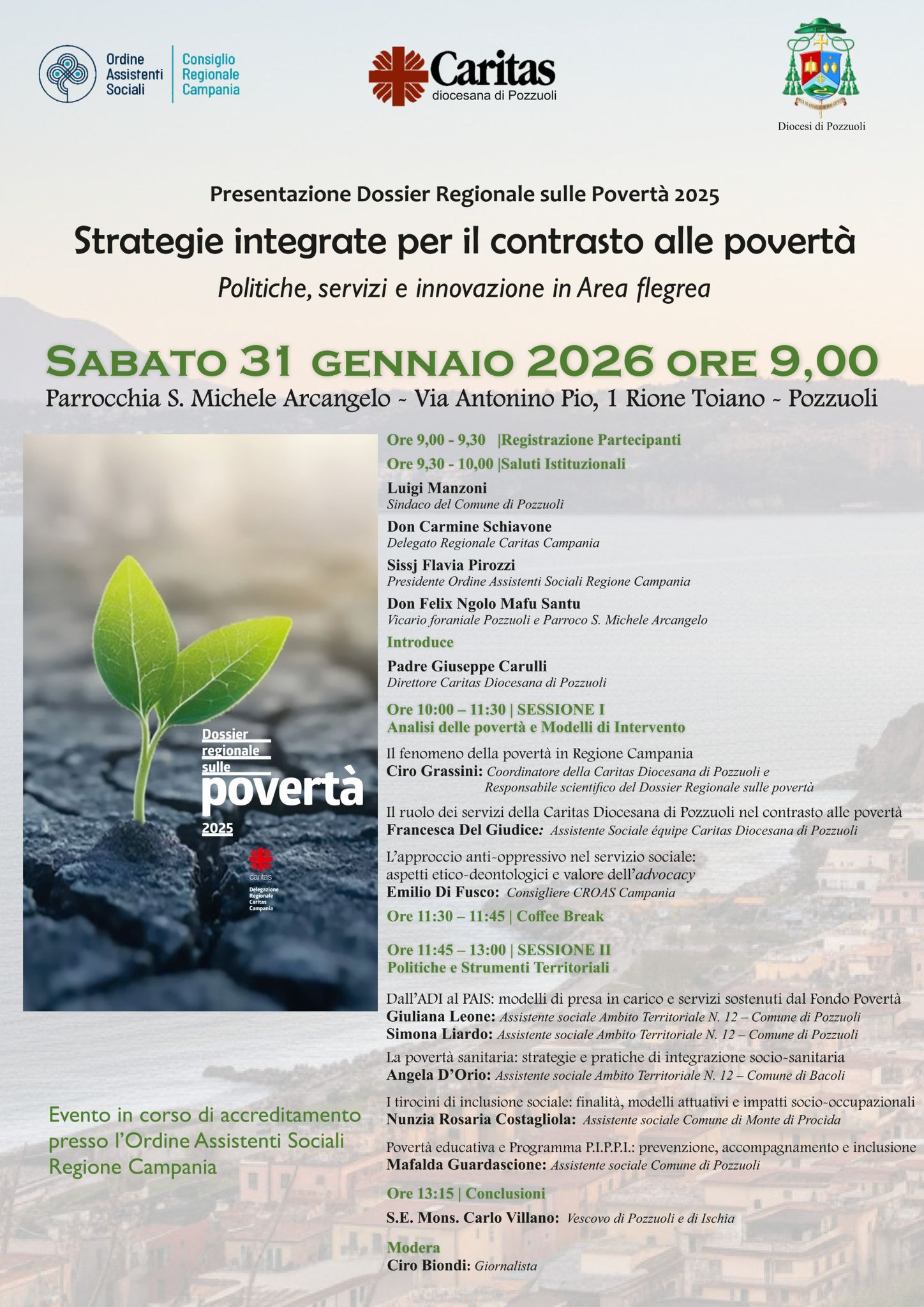 Sabato 31 gennaio (dalle ore 9), nel salone della parrocchia San Michele Arcangelo al Rione Toiano a Pozzuoli, si terrà la presentazione del Dossier Regionale sulle Povertà della Caritas Campania.