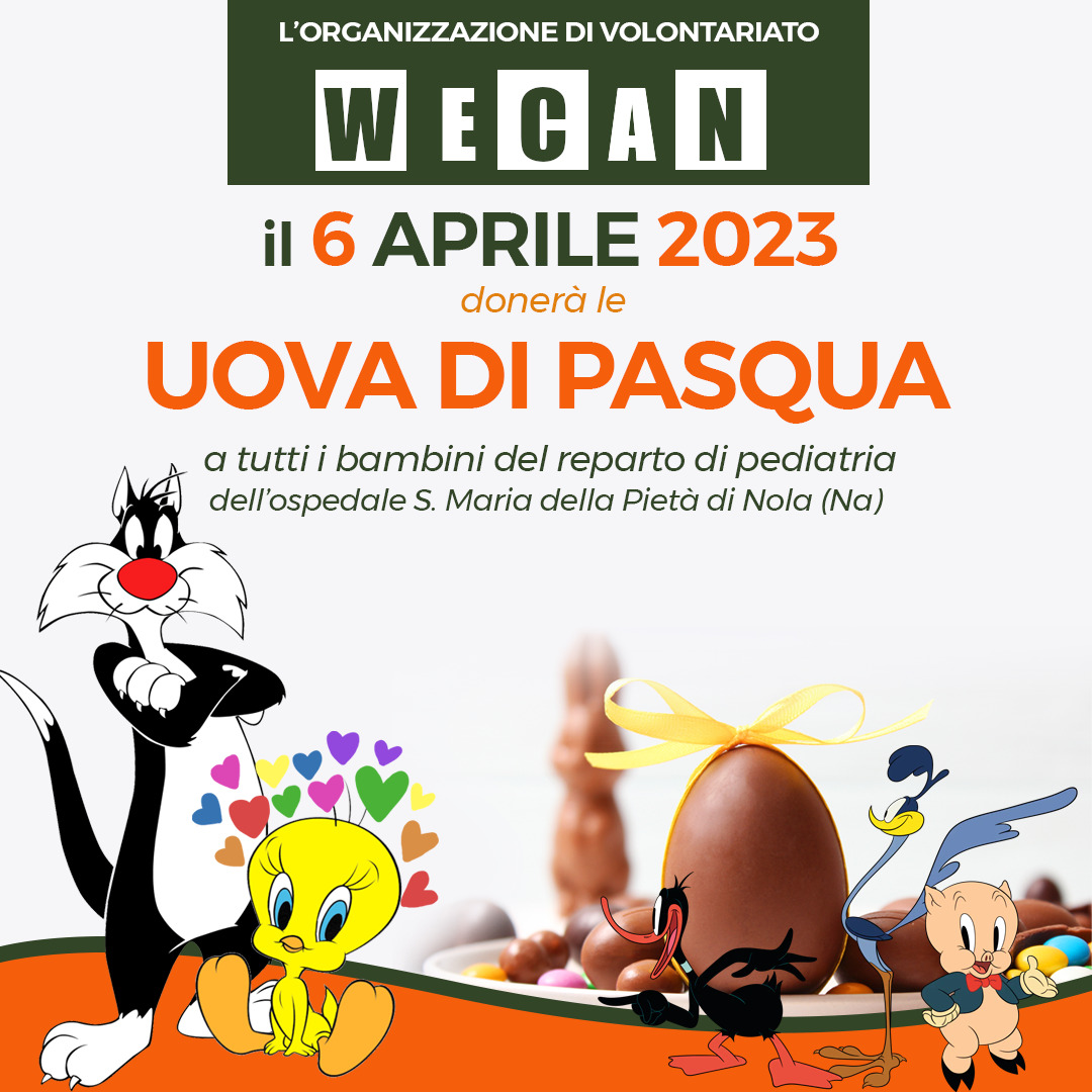 Il prossimo 6 aprile l’associazione We Can donerà le uova di Pasqua ai bambini ricoverati nel reparto di pediatria dell’ospedale di Nola, Santa Maria la Pietà. L’intento è di promuovere una giornata di sensibilizzazione e di solidarietà sociale nei confronti dei bambini. L’obiettivo solidale è quello di far arrivare la “PASQUA” laddove non c’è, perché la felicità e il sorriso di un bambino sono la più grande soddisfazione. “Si vuole esprimere la nostra vicinanza ai bambini dell’Ospedale “Santa Maria della Pietà” a nome di tutta l’Organizzazione di Volontariato “We Can”che da anni si occupa di campagne di solidarietà sociale. I volontari dell’associazione che distribuiranno le uova saranno travestiti dai personaggi Looney Tunes, molto amati dai bambini. Tenendo in considerazione le norme vigenti riguardo al Covid19 i volontari eseguiranno un tampone e saranno muniti di mascherina. Ringraziamo il primario del reparto di Pediatria e tutto il personale sanitario per la disponibilità e la collaborazione dimostrate”, spiegano i rappresentanti di We Can.