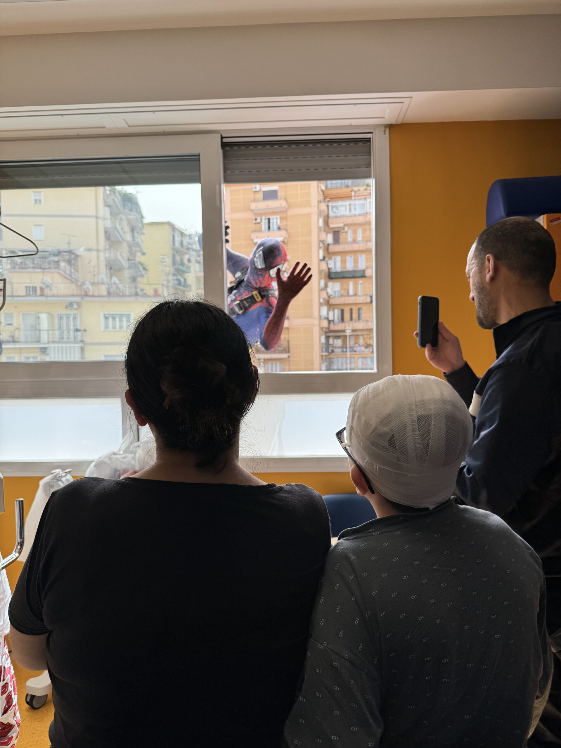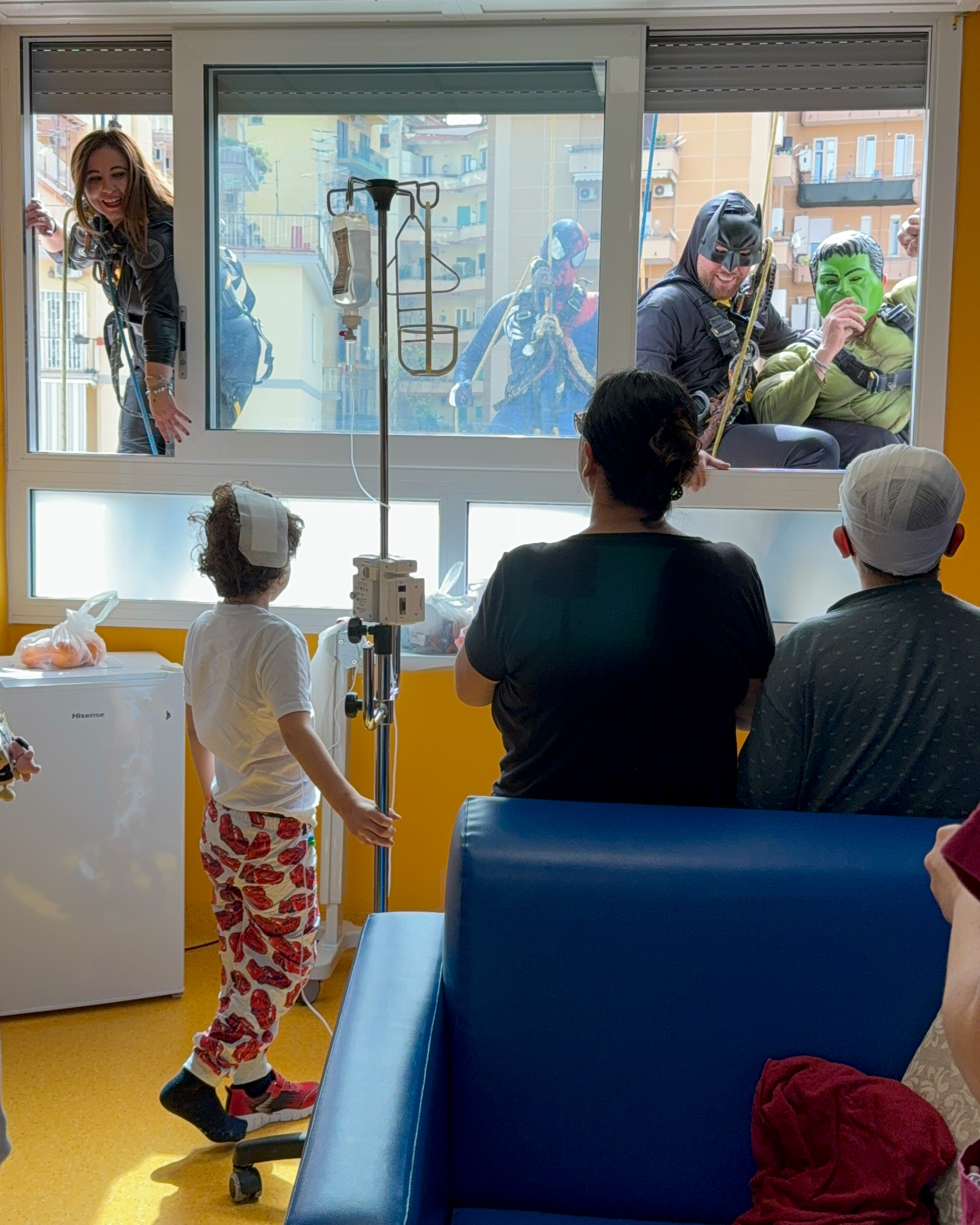 I supereroi, calandosi dal tetto dell’edificio, hanno fatto irruzione nei reparti, sorprendendo e incantando i piccoli pazienti.