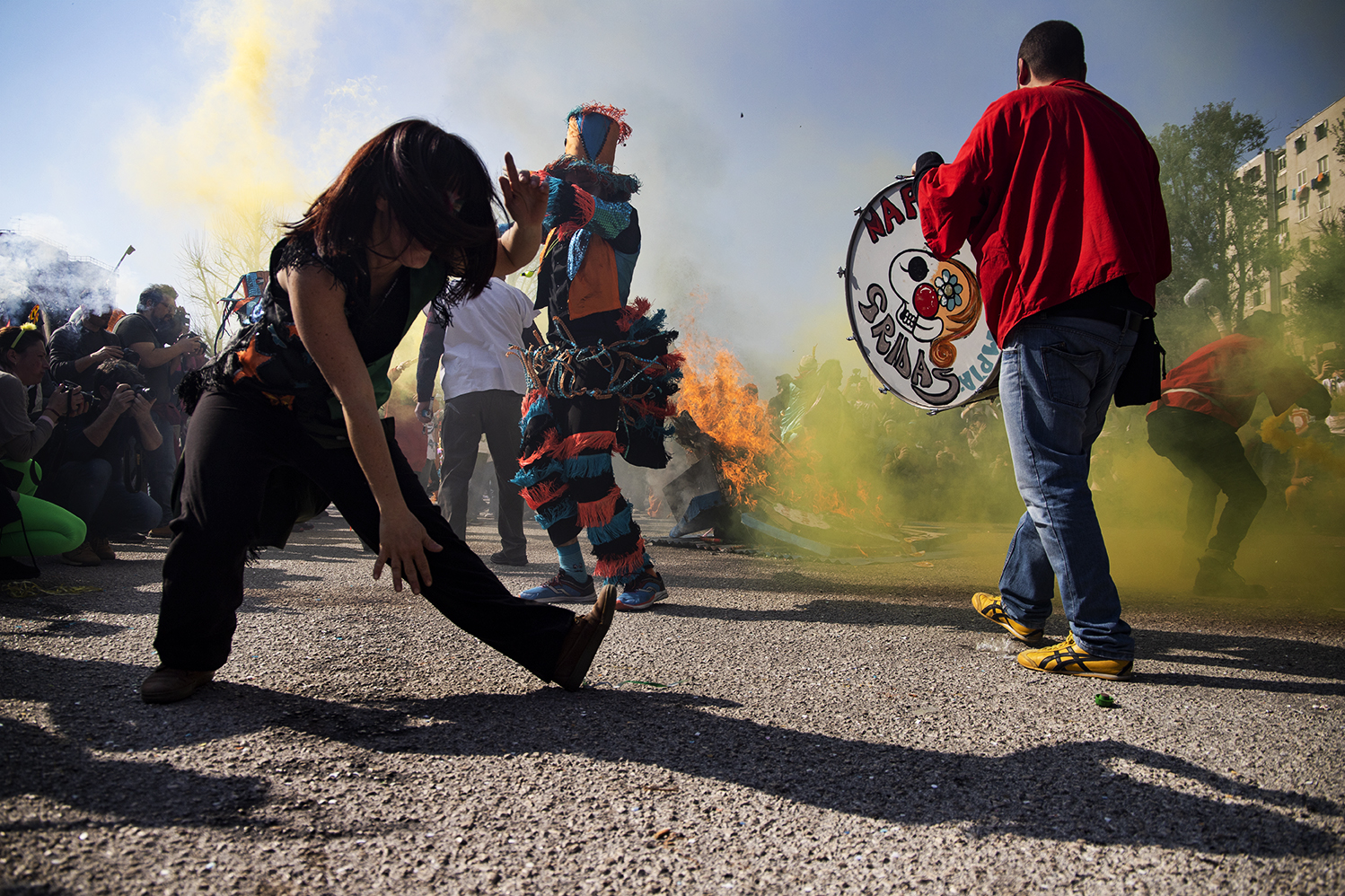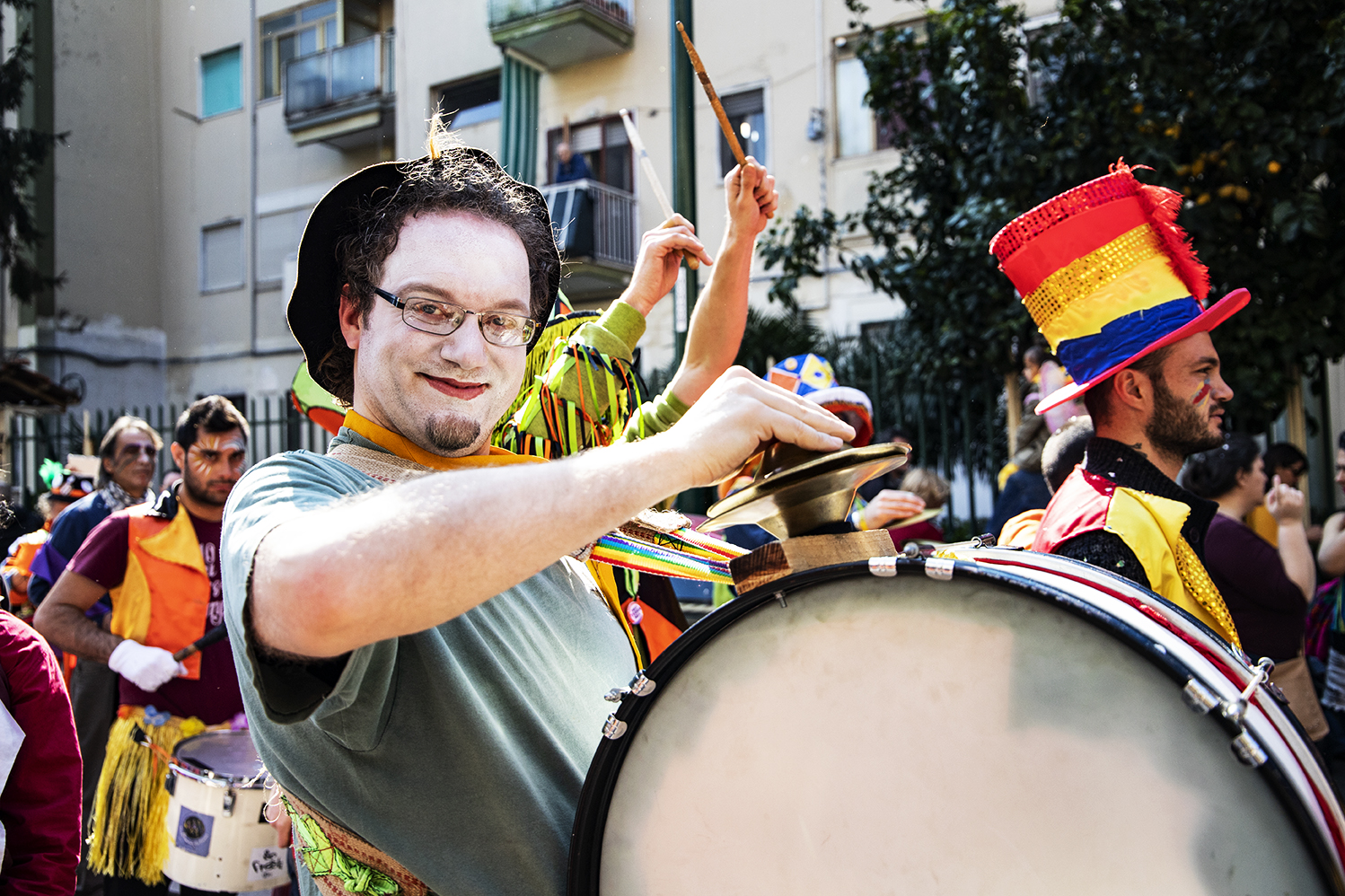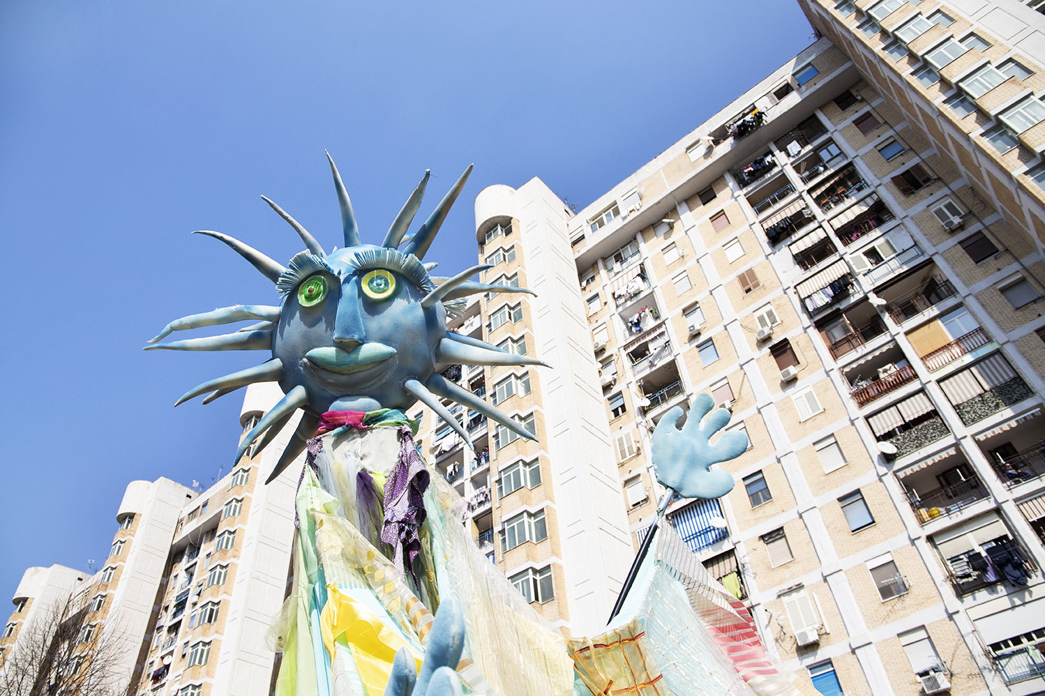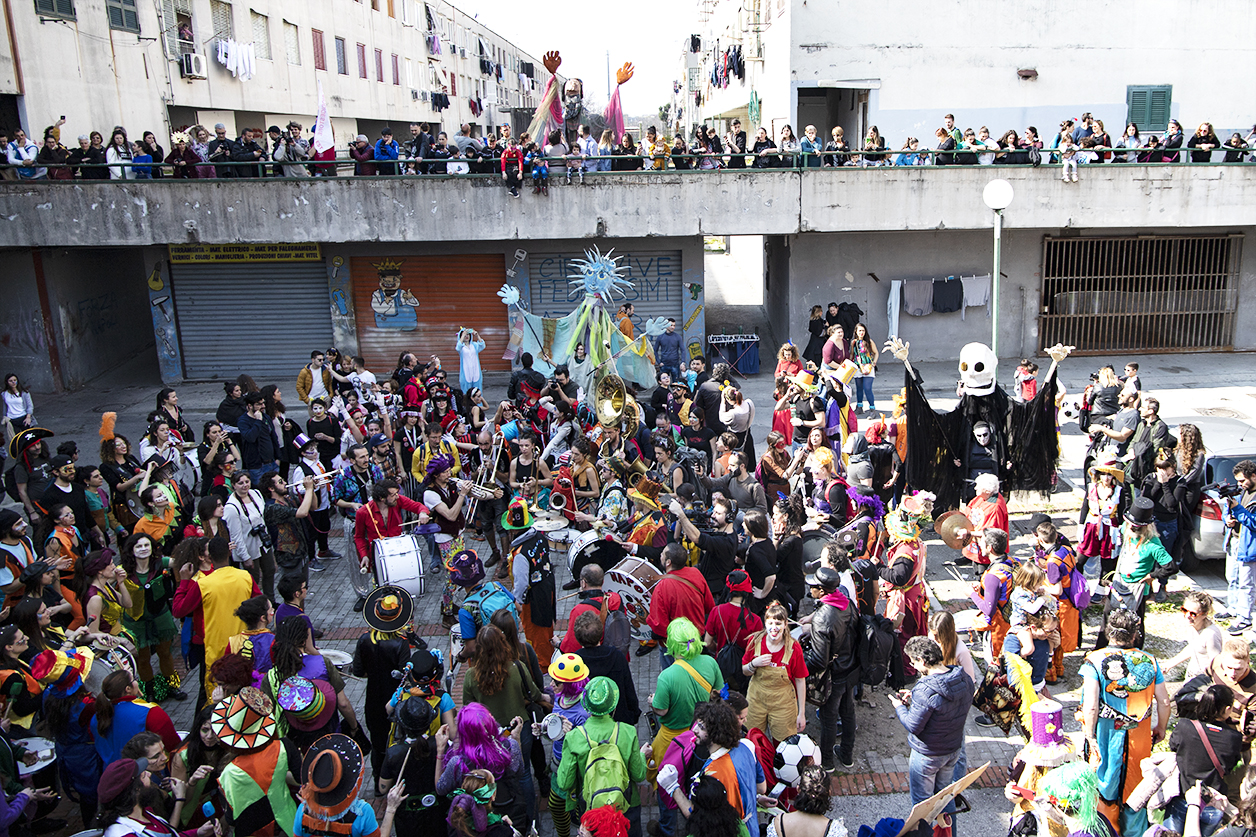 Con il loro potenziale simbolico, i carri, muovono il corteo in festa che, energicamente si insinua in un quartiere troppo spesso abusato da narrazioni televisive e giornalistiche quasi esclusivamente concentrate sugli elementi negativi di uno spazio periferico e marginalizzato. Per un giorno, grazie alla musica e ai balli delle murgas coordinate dalla BandaBaleno Murga di Napoli e seguite dai SambaPrecario di Roma e dalla Kikafessa Fanfare della Francia, il lavoro quotidiano delle associazioni e dei gruppi autorganizzati si realizza in una vera e propria “presa” del territorio. Cubi di cemento e geometrie di ferro non ostacolano la produzione di socialiatà e comunità: il quartiere si colora, grazie alla capacità immaginifica di chi lo vive e la festa interrompe la funzionalità quotidiana dello spazio urbano invadendo e colorando le strade e i lotti del quartiere. A Scampia, il carnevale, diviene quasi una necessità perché, anche se per poco lo spazio della periferia si trasforma, diventa uno spazio vissuto attraverso le immagini e i simboli che l’accompagnano. L’esplosione di colori, suoni, individualità e ruoli predeterminati smaschera altri mondi possibili, mondi autocostruiti che, dal basso, puntano a rompere la territorializzazione della socialità e colorare un’edilizia popolare che ogni giorno ricorda la monocromatizazione della differenza. La tinta unita della periferia è sostituita dall’azione policromatica degli abitanti dando vita, così, ad un momento di liberazione ed espressione della marginalità.