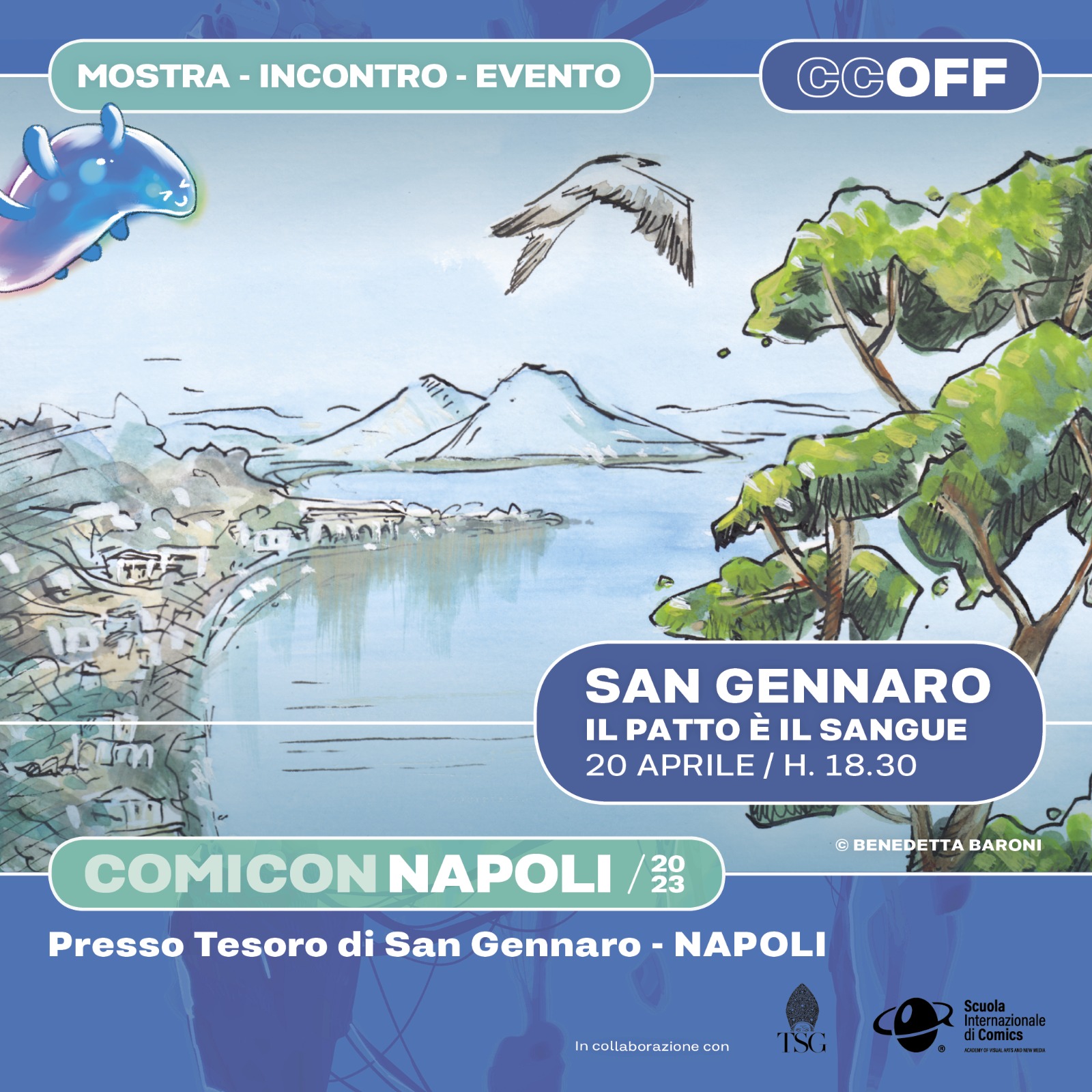 L’evento, realizzato dal Museo del Tesoro di San Gennaro in collaborazione con Scuola Internazionale di Comics di Firenze, rientra nel programma del COMIC(ON)OFF, la rassegna dedicata agli incontri con fumettisti, scrittori, illustratori, attori e musicisti che, in diversi spazi culturali della città, accolgono il pubblico durante le settimane che precedono e seguono l’arrivo del COMICON, il festival Internazionale della Cultura Pop in programma quest’anno presso Mostra d’Oltremare (28 aprile al 1 maggio).