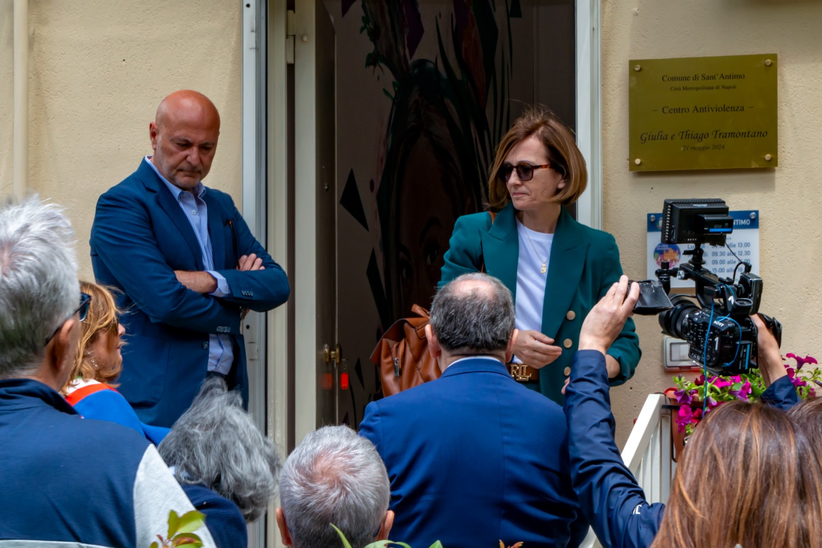 È stato inaugurato oggi,  martedì 21 maggio al Comune di Sant’Antimo il nuovo Centro antiviolenza intitolato a Giulia e Thiago Tramontano, uno spazio di ascolto e aiuto per tutte le donne vittime di violenza e soprusi; un luogo più accessibile e riservato rispetto agli attuali uffici,  abbellito e reso più accogliente grazie all’intervento artistico della muralista Trisha Palma. Presente all’inaugurazione anche la famiglia della giovane Giulia Tramontano, il Prefetto Michele Di Bari, il Procuratore Antonietta Troncone, la dottoressa Nunzia Brancati- dirigente anticrimine PS e il consigliere  del Ministro della Cultura Luciano Schifone.
