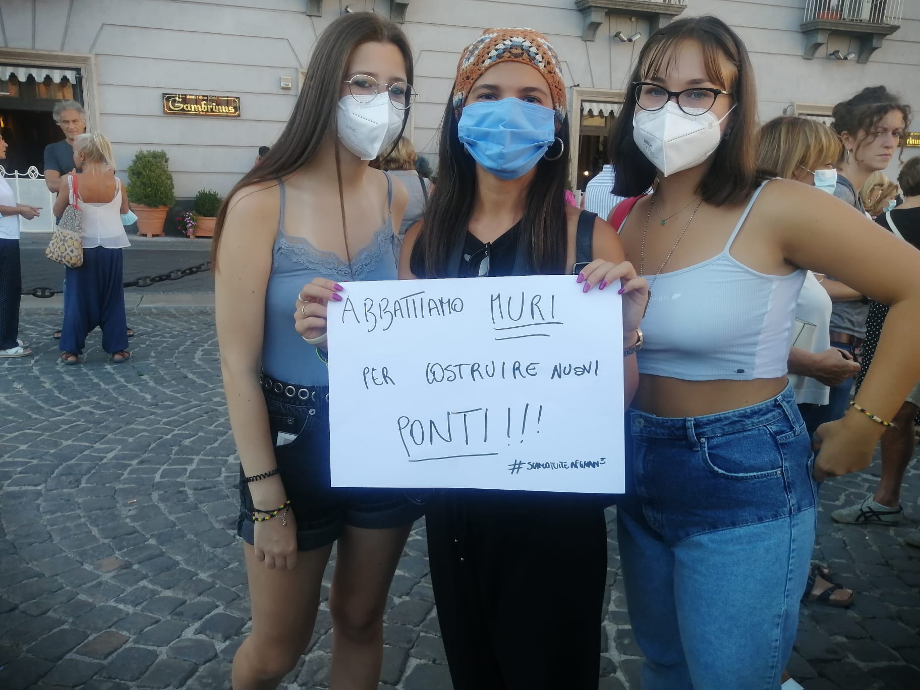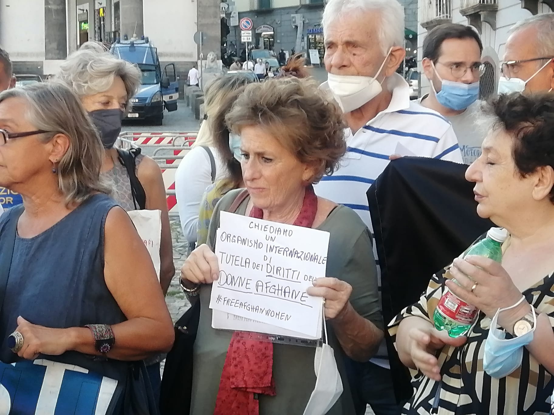 Gli interventi al Flash Mob – Diversi gli interventi al flash mob di ieri in piazza del Plebiscito, che replica il sit-in della scorsa settimana in sostegno delle donne afgane quando gli organizzatori hanno indossato per solidarietà il burqa. Giovanna Cardarelli, attivista Cisda, Coordinamento italiano sostegno donne afgane ricorda come alcune attiviste del movimento nato nel 1999 «continueranno a stare lì in Afghanistan per continuare la lotta in difesa delle donne, mettendosi in clandestinità. Le nostre compagne si sono dovuto attrezzare per mettere in sicurezza le donne vittime di violenza e le bambine. Ci chiedono però di non spegnere i riflettori sull’Afghanistan per la protezione delle donne, che pagheranno un prezzo altissimo come è accaduto quando già in passato hanno governato i talebani. In questi 20 anni – dice Cardarelli – si è parlato molto di Kabul, a Herat perché c’era il contingente italiano ma poco di Afghanistan come ci siamo resi conto ogni volta che siamo andate in quel Paese. I talebani dal Paese non se ne sono mai andati, nel Sud hanno sempre governato loro facendo strage nei villaggi con le donne fuggite con i bambini. Abbiamo ascoltati racconti allucinanti di quanto accaduto. E anche la parte colta del Paese è fuggita, ai Talebani non fa piacere che rimanga perché potrebbe infastidirli. I corridoi umanitari servono ma non saranno sufficienti». Laura Marmorale della Mediterranean Saving Humans spinge, consapevole di quanto accaduto in altre Parti del mondo dalla situazione politica instabile, come i corridoi umanitari siano un viatico necessario per mettere in sicurezza una popolazione inerme verso la devastante furia del regime talebano. «I corridoi vanno attivati e mantenuti non solo a Napoli, in Campania e in Italia ma in tutta l’area della Comunità europea. Le donne, le persone istruite e che hanno avuto un ruolo nel tentativo di cambiare il Paese sono quelle principalmente ricercate, rincarcerate, torturate e uccise. Ma la possibilità di scampare da una morte certa deve essere garantita a tutti. Non dobbiamo accontentarci di una quota e ragionare, appunto, per quote. Anche la Comunità Europea, che aveva appoggiato dell’idea di esportare la democrazia, deve assumersi la responsabilità ripensando alla gestione dei flussi migratori, delle frontiere e alla capacità di accoglienza per tutti».«Difendiamo e accogliamo quelle migliaia di persone in fuga per salvare se stesse e i propri cari. Sosteniamo le afgane e afgani che testimoniano e lottano per la libertà. Denunciamo gli Stati Uniti che hanno eretto muri e si sono preoccupati solo di bloccare il flusso dei profughi. E ora l’Unione Europea dice che si deve trattare con i talebani. Sicuramente lo faranno a breve anche gli Usa, che già avevano firmato accordi con loro. La Cina, la Russia e la Turchia lo stanno già facendo» denuncia l’associazione antirazzista e interetnica 3 febbraio, tra gli organizzatori della giornata di ieri in piazza del Plebiscito.