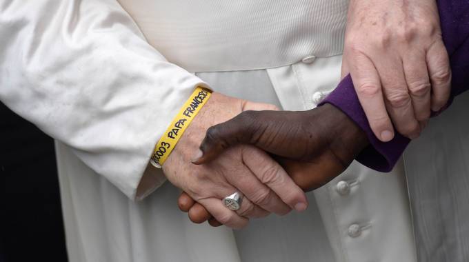 Papa Francesco riceve il braccialetto identificativo nell’ Hub migranti di Bologna