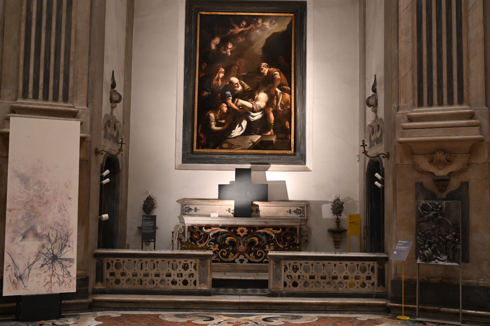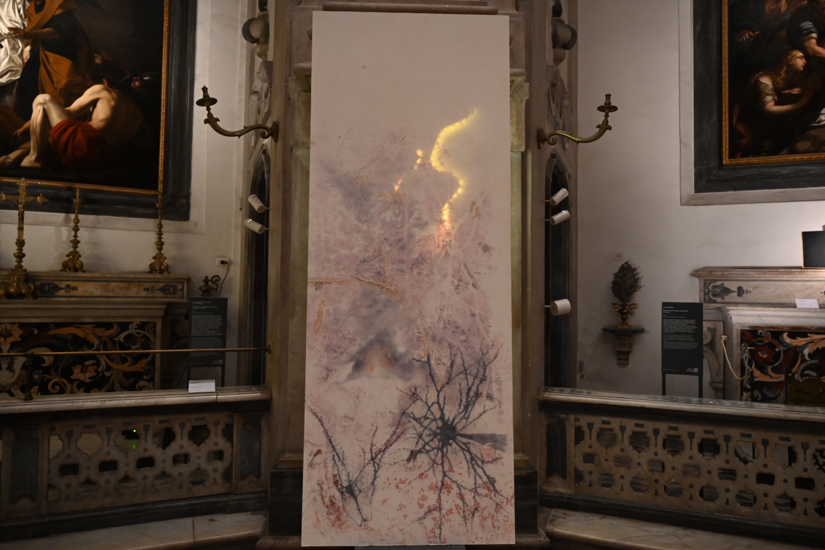 Beatrice Caracciolo prende le mosse da temi e capolavori pittorici del passato. Nell’opera Caravaggio II, omaggio alle Sette Opere di Misericordia, l’artista fa emergere la gravità violata da una voragine di chiaroscuri fluttuanti e quasi divorati dalla tela. Mentre Edgar Honetschläger nel suo Michelangelo Caravaggio ritrae una sedia, architettura pittorica di anime vicine e lontane, in una sorta di gioco che trasforma le immagini che vagano nello spazio grezzo delle tele e da cui scaturisce una sequenza di rebus sulla psiche umana. Ancora, il conflitto in Ucraina ispira la donazione dell’opera al Pio Monte da parte di Andrew Huston Crossroads Malevich. La sua croce è un omaggio/confronto con il celebre dipinto dell’artista ucraino Kazimir Malevich ed evoca le asperità della guerra. L’opera della giapponese Mariko Mori, Primal Energy, è un simbolo di gratitudine verso gli ecosistemi e le risorse naturali presenti in tutto il mondo: una preghiera di pace e di armonia, che ricorda come ogni essere vivente esiste per custodire i tesori della Terra.