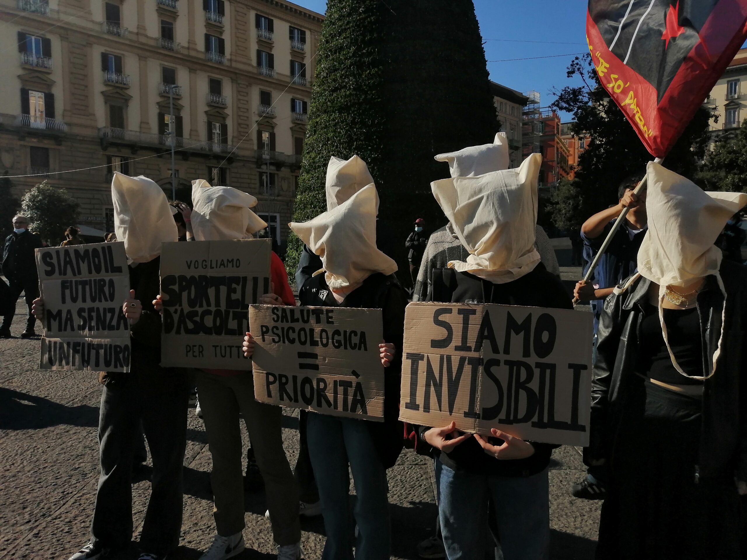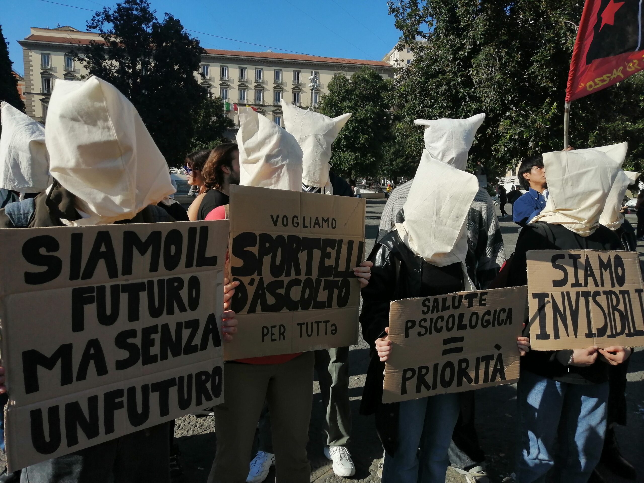 Priorità alla salute psicologica – Durante il corteo di questa mattina, all’altezza di piazza Municipio, alcuni ragazzi si sono incappucciati esponendo cartelli per chiedere sportelli d’ascolto. “Siamo il futuro senza futuro’’. “Siamo invisibili’’. “Salute psicologica= priorità’’ si leggeva su alcuni pezzi di cartone. In proposito, queste le parole Marco M. degli studenti autorganizzati campani: «La salute psicologica è tra i punti principali di quelli portati in piazza. In questi anni di pandemia c’è stato un completo abbandono, c’è stato un totale menefreghismo delle istituzioni che hanno pensato soltanto a far ripartire l’economia mentre gli studenti sono stati lasciati soli dinanzi a un pc. Questo perché gli spazi d’ascolto non garantivano un profitto. Chiediamo sportelli d’ascolto, consultori nelle Asl accessibili a tutti gli studenti. Ci sono ragazzi – ha aggiunto Marco -che non riescono o possono esprimere un disagio all’interno della propria famiglia. C’è ancora lo stigma di andare dallo psicologo per esternare quello che sentono i ragazzi».