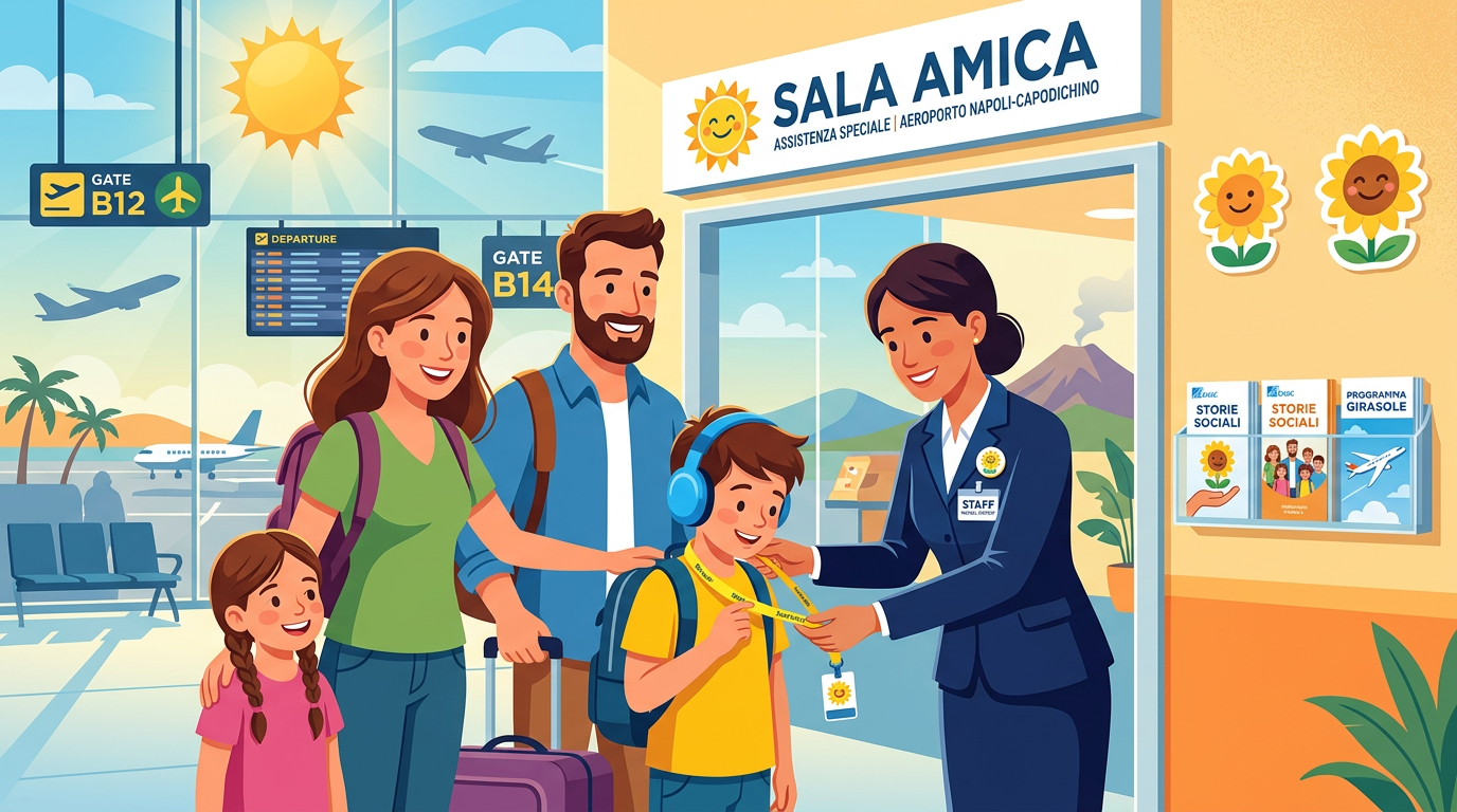 Lanciato nel 2015 dall’Ente Nazionale per l’Aviazione Civile (ENAC) in collaborazione con Assaeroporti e associazioni come ANGSA e FISH,  il progetto “Autismo, in viaggio attraverso l’aeroporto” mira a facilitare il percorso aeroportuale per persone autistiche e loro accompagnatori. Napoli, gestito da GE.S.A.C., è stato tra i primi aeroporti italiani ad aderire, implementando strumenti specifici come brochure illustrate, video tutorial e “storie sociali”: semplici sequenze di immagini con testi brevi che descrivono passo per passo check-in, controlli di sicurezza, sala d’attesa e imbarco. Queste risorse, disponibili sul sito ENAC e in Sala Amica, aiutano a ridurre il sovraccarico sensoriale – rumori, luci, folle – preparando i passeggeri a ogni fase.