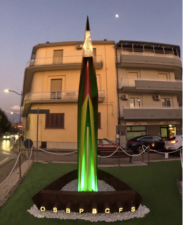 Sono presenti nella parte alta la mitra e il pastorale, simboli del Santo, mentre alla base è posizionata una barca che evoca il ritorno di San Paolino e la sua redenzione. Ammirando lateralmente la scultura si nota in alto un riquadro nel quale si vede la figura del Santo e un trapezio che richiama la forma di una campana, il cui uso nelle chiese si dice sia proprio opera del santo di Nola. Sempre lateralmente, all’altezza della barca, sono posizionate le iniziali delle corporazioni che alzano il giglio ovvero nell’ordine Ortolano, Salumiere, Bettoliere, Panettiere, Beccaio, Calzolaio, Fabbro e Sarto. Anche l’uso dei colori è specifico: c’è il rosso che richiama l’amore per il divino, il giallo per la santità, l’oro che è il colore della trasfigurazione e i toni del legno del corpo principale della statua che riprendono i colori delle strutture dei gigli. Il materiale impiegato per la costruzione è acciaio corten, materiale pronto a resistere agli agenti atmosferici e perfetto per l’istallazione en plein air. Un’opera elegante anche nel nome che in città è piaciuta a tutti.