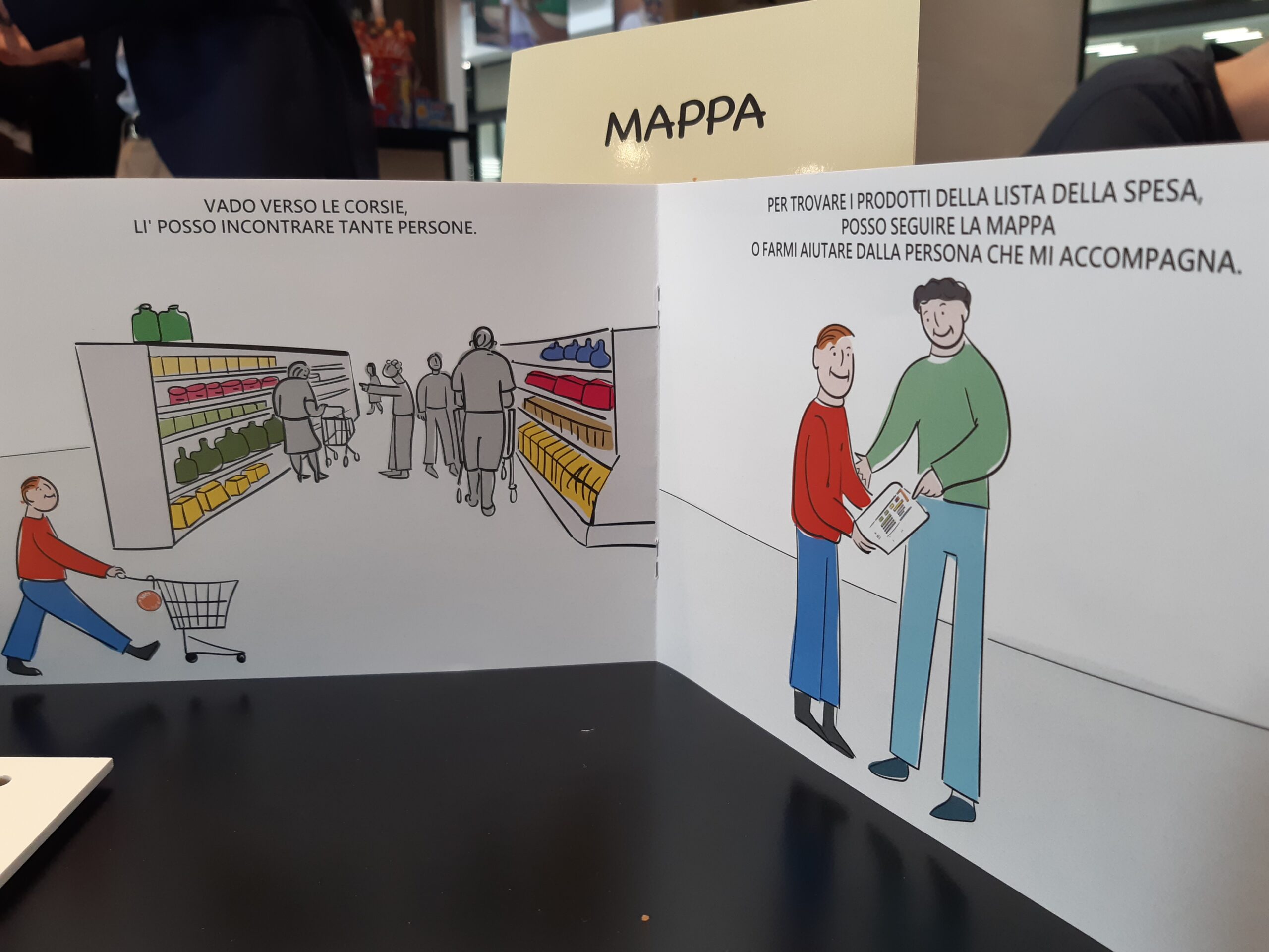 L’ultimo degli ausili visivi disponibili nel punto vendita di via Gramsci è un kit, che può essere direttamente richiesto al personale Coop, che è stato appositamente formato. Tale kit si compone di un libricino contenente che spiega, prevalentemente tramite immagini, come ci si deve muovere all’interno del supermercato. E, infine, di un album “stacca e attacca” in cui sono presenti immagini illustrative degli articoli presenti nel supermercato grazie al quale i clienti potranno “trascrivere” in formato visuale la lista della spesa, così da avere ulteriore semplicità nel giro degli acquisti.