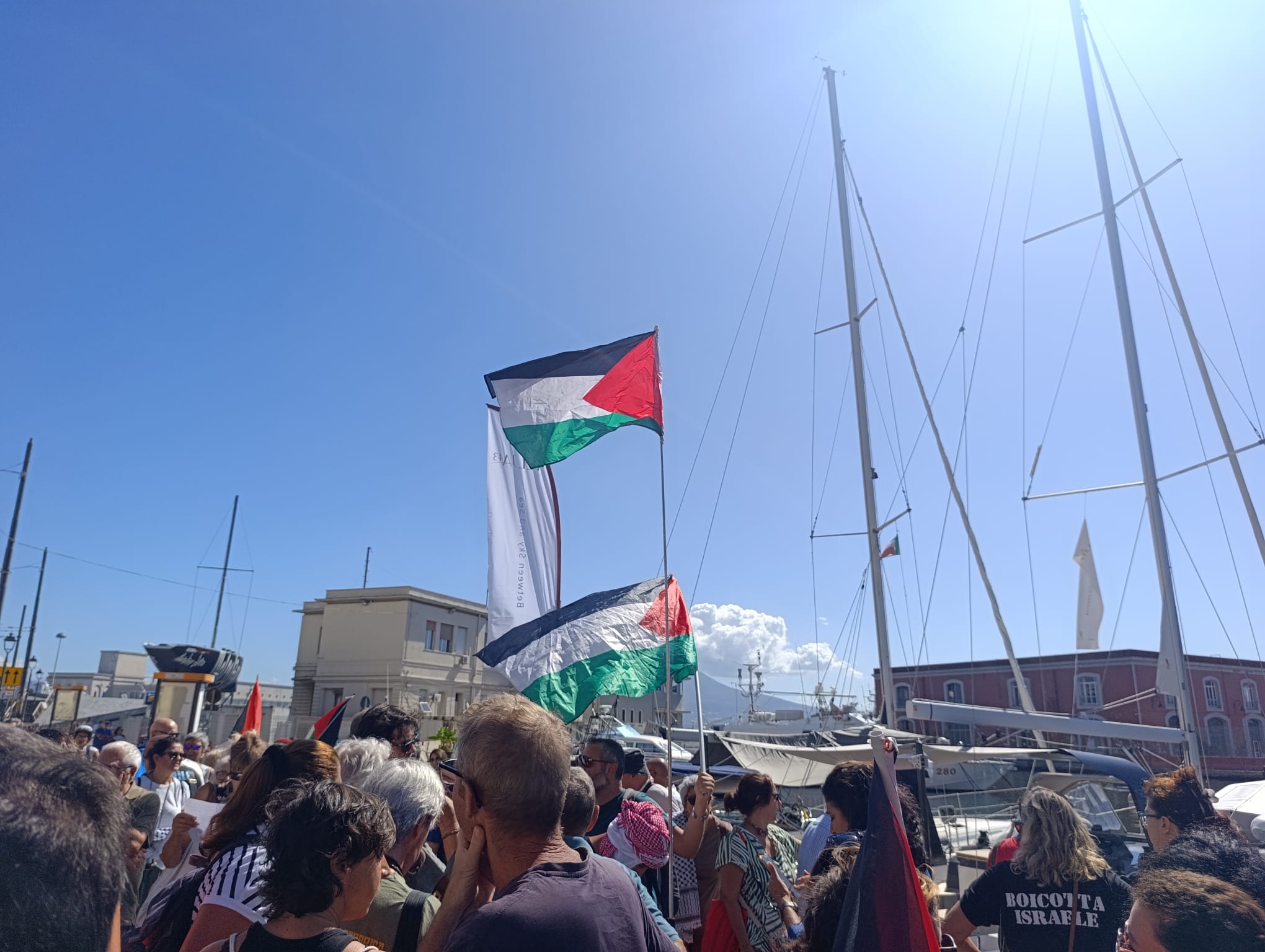 Sulla missione della Flotilla, Titta Musto si raccomanda: «È una missione delicata, invitiamo tutti a seguire i movimenti sui canali ufficiali del Global Sumud Flotilla e di Global Movement to Gaza. Dobbiamo essere pronti a situazioni di rischio. L’ultima missione della flotilla di luglio- ricorda ancora Musto – formata da gente non violenta, sono stati arrestati da uomini bardati dell’esercito israeliano. La barca è ancora sotto sequestro e i beni a bordo che volevano essere consegnati, giocattoli, presidi medici, giocattoli, cibo, sono deperiti insieme all’imbarcazione». Marta Di Giacomo del Laboratorio Insurgencia, facente parte del Global Movement to Gaza, si mostra orgogliosa di Napoli quali «città di pace, solidale al popolo palestinese. C’è una parte sana che ancora difende ancora un briciolo di umanità. Mentre gli eserciti difendono le barbarie di Israele, con la segregazione e l’apartheid del popolo palestinese in Cisgiordania e Gaza, c’è chi fa prevalere l’umanità». Per gli appartenenti all’associazione Jonathan, che si occupa di dare un futuro diverso attraverso il lavoro alle barche di giovani in area penale, «già il tentativo di rompere quel vergognoso assedio è una vittoria. Noi ci occupiamo di ragazzi in area penale, vogliamo tentare di far scrivere ai nostri giovani un futuro diverso e questa nostra sensibilità ci ha fatto senza indugio ad appoggiare l’iniziativa napoletana al Molosiglio e di via Acton».