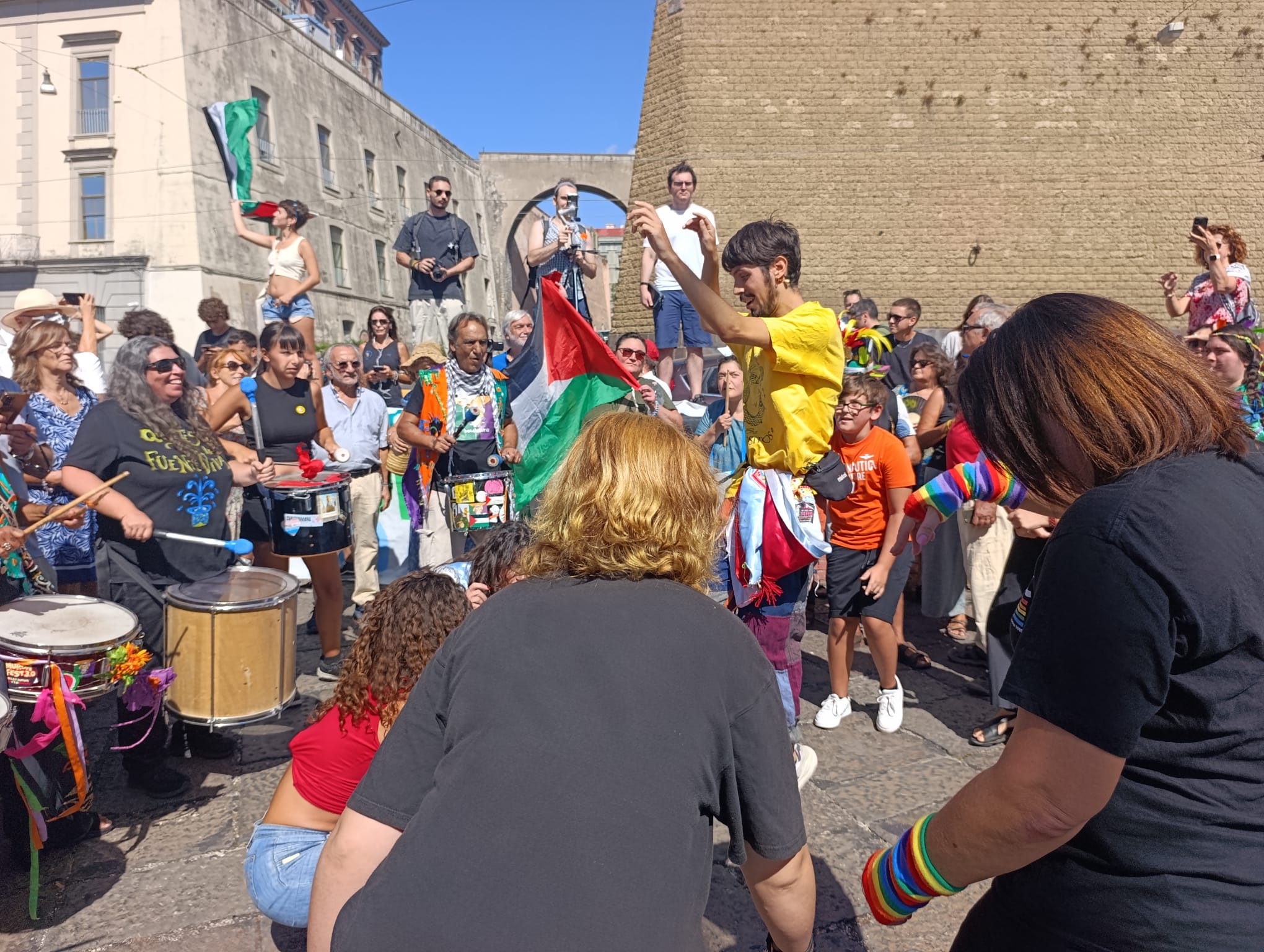 Titta Musto, referente della delegazione regionale del Global Movement to Gaza, ribadisce: «Noi siamo una flotta di terra non violenta a sostegno della Global Sumud Flotilla, una missione umanitaria che va per mare per sfondare l’apartheid per portare aiuti umanitari e dichiarare ai governi, silenti e complici, che la società civile e si è estesa di tutte le realtà di questa terra». Musto, unitamente agli altri organizzatori della mattinata napoletana di appoggio alla Palestina assicura la «crescita costante del movimento e della voce unica che sostiene la flotta. Noi portiamo un’idea di umanità che Israele e i governi complici non hanno». In tanti in Italia dichiarano la propria delusione verso il tipo di narrazione giornalistica di quanto accade a Gaza e in Cisgiordania da decenni. Mauro Forte, già tra i portavoce della piattaforma Free Julian Assange, dedicata al creatore di Wikileaks liberato dopo anni di carcere e battaglie per la sua scarcerazione, non le manda certo a dire alla stampa nazionale. «Abbiamo un’informazione di Stato che continua a raccontare menzogne. Ci sono giornalisti che hanno parlato di allontanamento volontario da Gaza dei palestinesi. I media devono provare a raccontare la verità, ne va della libertà di tutti noi». A imbarcarsi simbolicamente da Napoli, tra gli altri, Hamid Alfarra, nativo di Khan Younis a Gaza e attivista pro Pal, attualmente residente nella provincia di Salerno. «Sumud – spiega Hamid – significa resilienza, quella del popolo palestinese e quello del popolo italiano che vuole lasciare i palestinesi da soli». Anche Alfarra fa cenno al tipo di informazione veicolata sulle morti a Gaza. «Vero, le notizie arrivano ma in verità non tutti i massacri vengono raccontati. I veri eroi sono i giornalisti, i bambini, i giovani a Gaza che attraverso un telefono ogni secondo trasmettono la distruzione. Soltanto sabato ci sono state 200 persone uccise a Gaza» mentre oltre un milione di uomini, donne e bambini stanno cercando di raggiungere il Sud della Striscia «senza però», si rammarica Hamid Alfarra, «un vero corridoio umanitario».