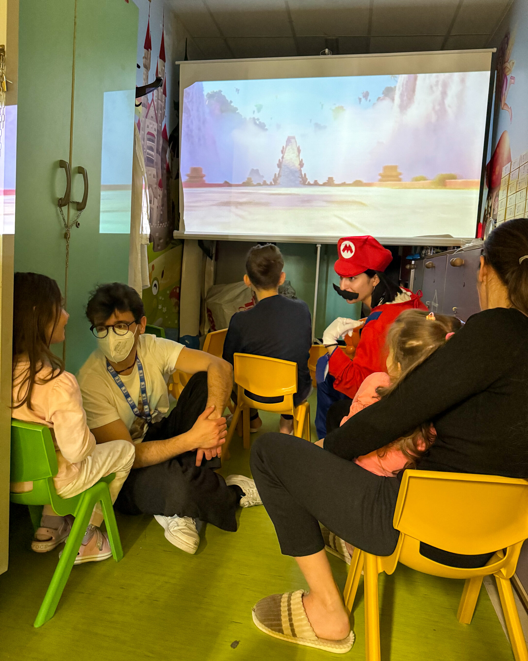 Il progetto ha preso il via il 5 aprile all’Ospedale Santobono di Napoli, con due proiezioni: una mattutina e una pomeridiana nei reparti di Chirurgia d’urgenza e di Pediatria d’urgenza, con la proiezione del film “Super Mario Bros”.