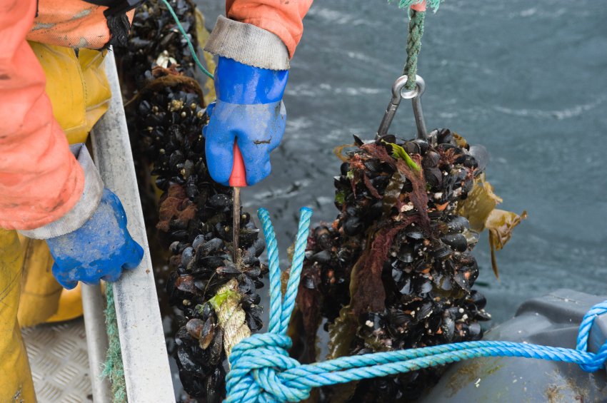 mussel farmer cutting of mussels from the rope they where attached to on lake Slapin, Scotland
