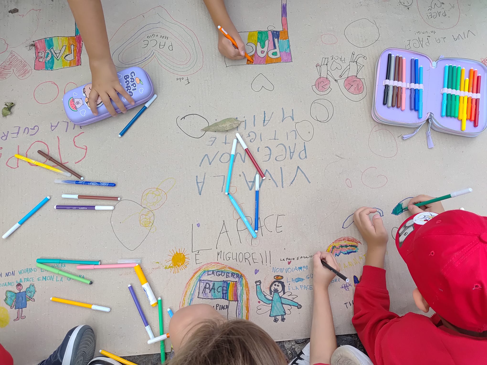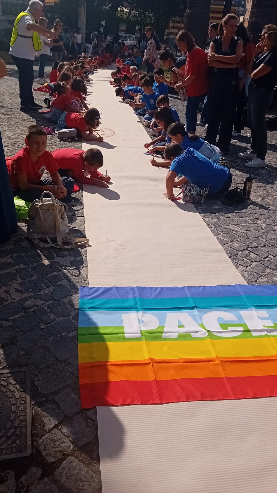 Per i giovanissimi sfollati di Gaza, i bambini sangiorgesi – guidati dalle insegnanti – hanno realizzato un’enorme opera collettiva: un lunghissimo foglio bianco trasformato in tela d’artista, pieno di colori, simboli di speranza e di pace.