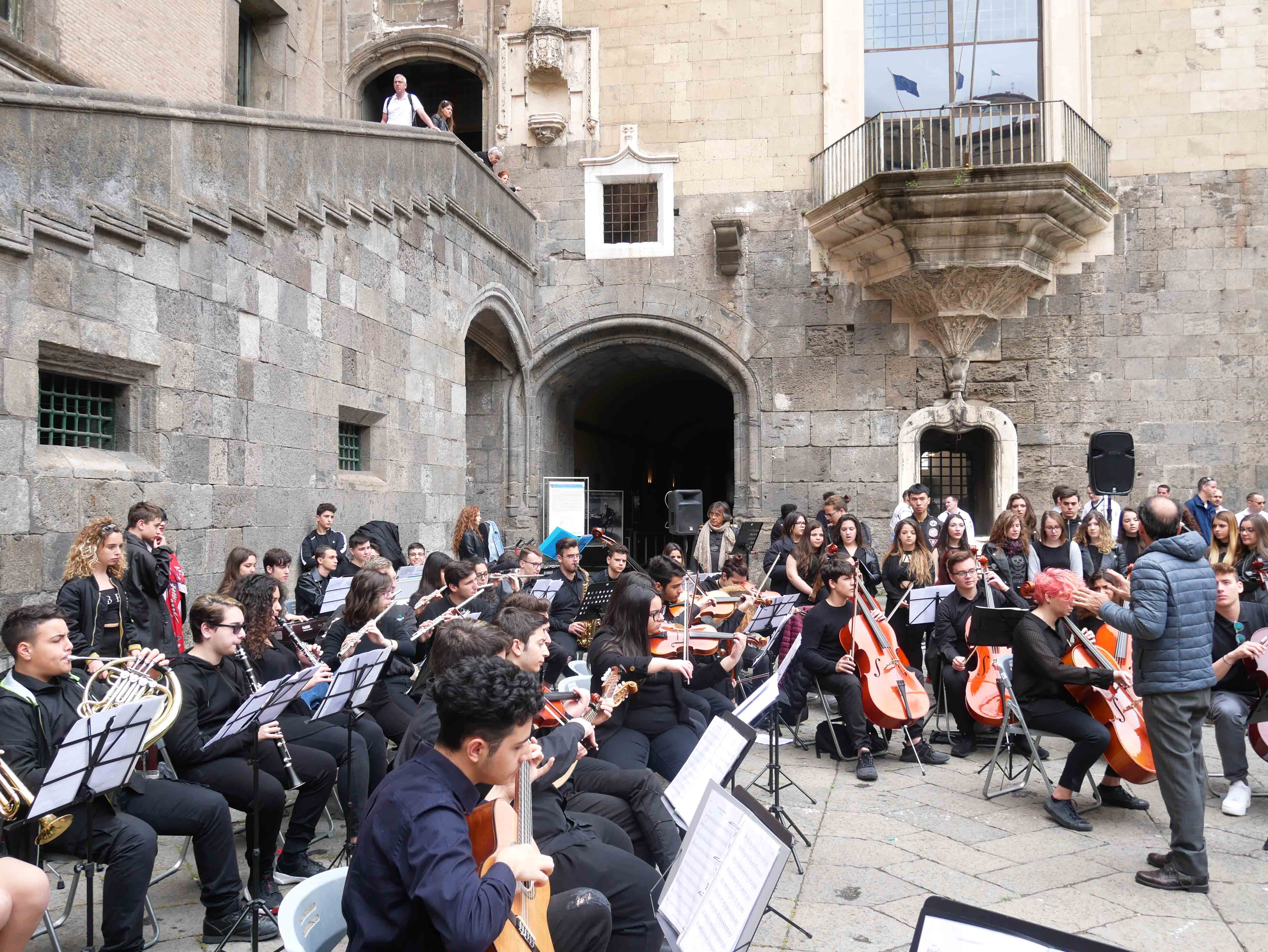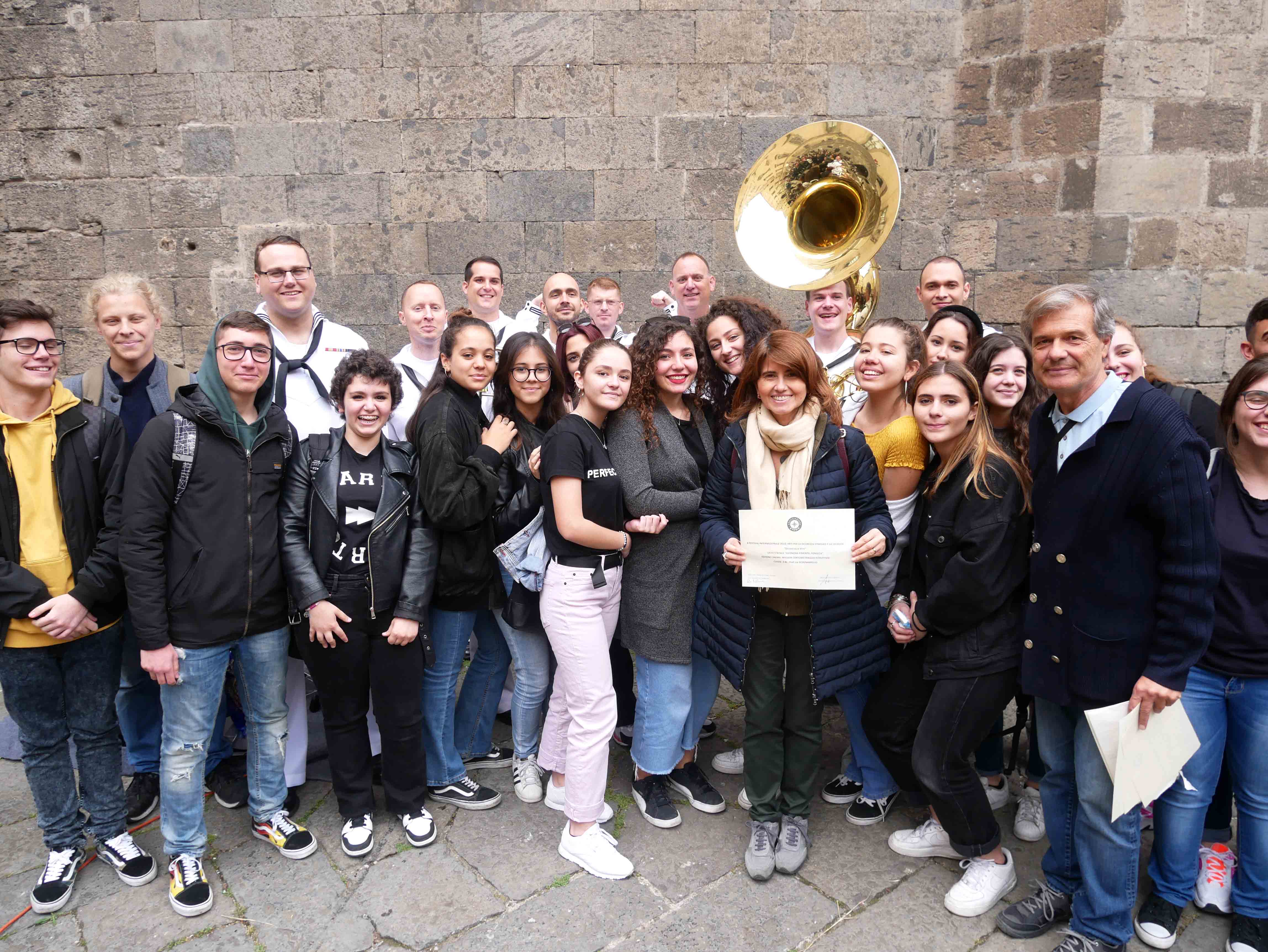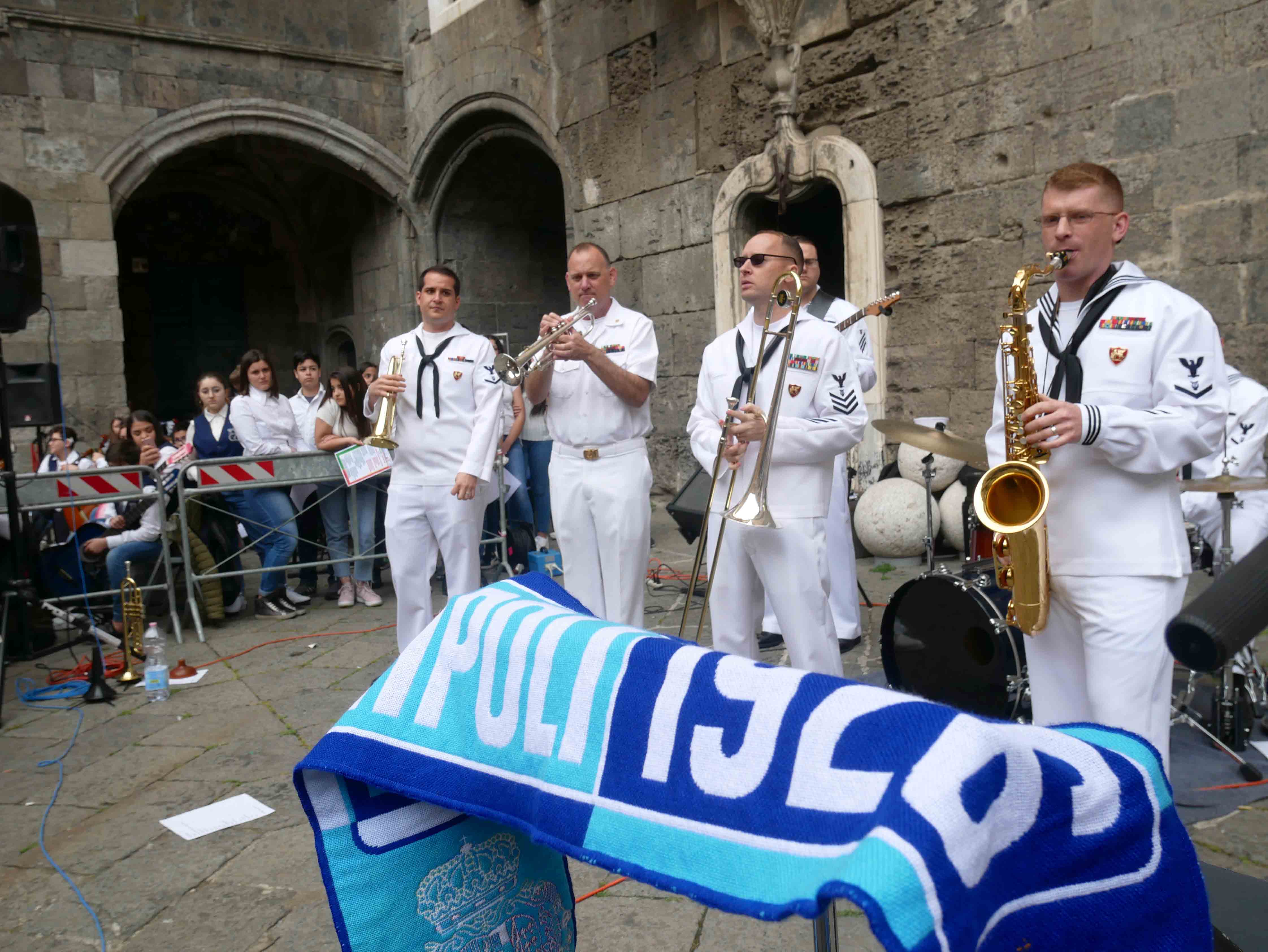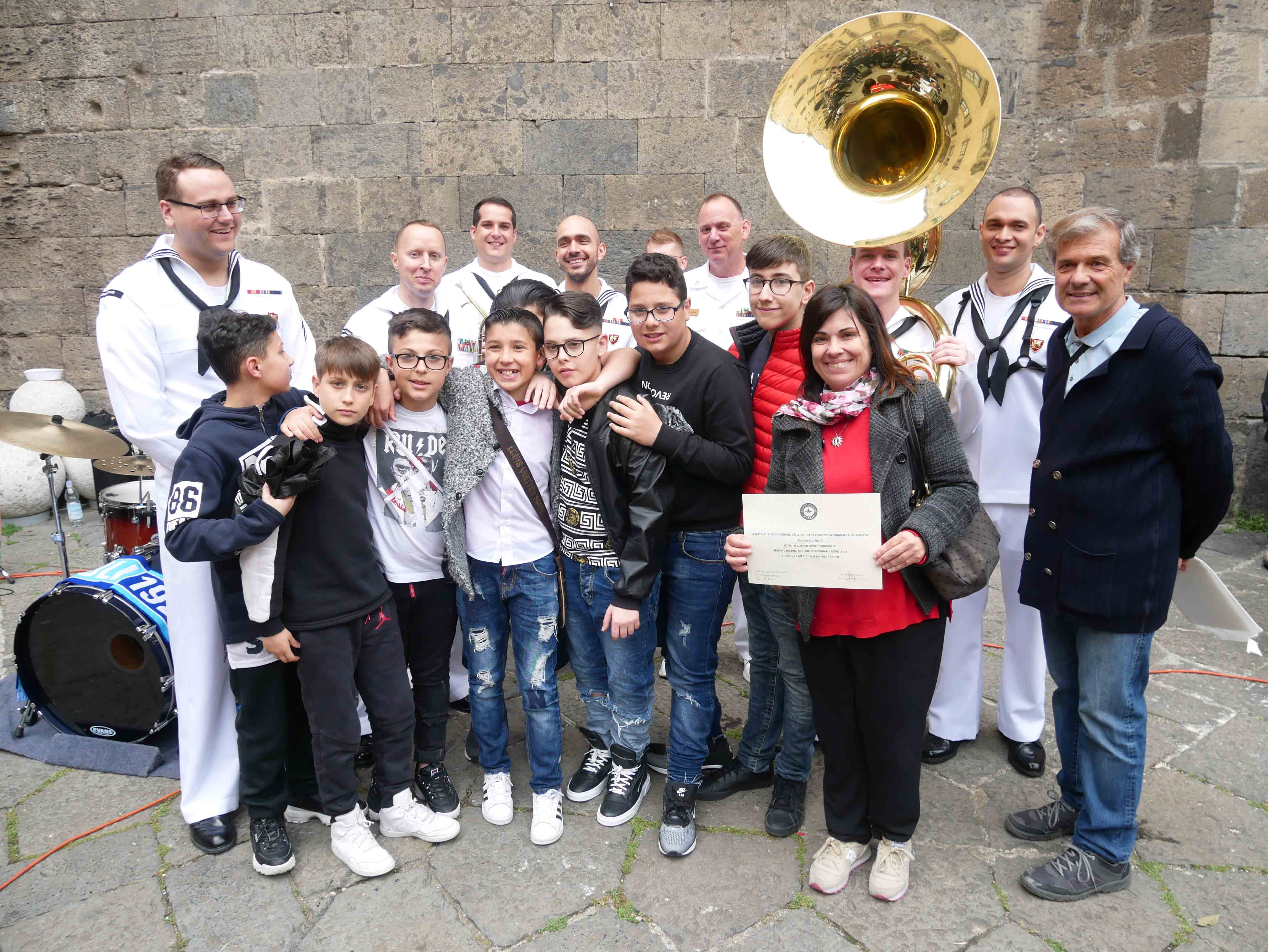 Si è svolto nel cortile del Maschio Angioino l’ottava edizione del “Festival internazionale delle arti per la sicurezza stradale e la legalità – Occhio alla vita”. Un’iniziativa promossa dall’ente del terzo settore “Etesia” che per tutto l’anno ha coinvolto una ventina di scuole, circa diecimila ragazzi, di ogni ordine e grado sul territorio di Napoli e provincia con tanti progetti teorici e pratici volti all’educazione civica. Il presidente di Etesia Antonio D’Ambrosio: “Durante l’anno tocchiamo temi importantissimi come la sicurezza stradale, il cyberbullismo, l’uso e abuso di sostanze stupefacenti, il corretto utilizzo di internet, e tutte quelle problematiche legate al disagio giovanile e alle devianze. Il tutto viene trattato attraverso l’arte per coinvolgere sia i ragazzi più piccoli che i grandi, con musica, balli, disegni, ma sono stati realizzati anche cortometraggi”. Al Maschio Angioino oggi erano presenti classi di quattro differenti scuole, Palizzi Boccioni, Scialoja Cortese, Di Capua, Dumas, che, accompagnate dalla banda musicale della Marina Militare degli Stati Uniti d’America, hanno presentato i loro progetti di fine anno. Le scuole partecipanti sono infatti italiane, francesi e americane. Alla fine delle esibizioni, gli stessi ragazzi hanno votato i progetti e sono stati premiati. Il cortile del Maschio Angioino si è animato quindi di tante musiche diverse, italiane, internazionali, napoletane, ed i ragazzi hanno suonato, cantato e ballato insieme ai militari della Marina. Da questa iniziativa partiranno corsi specifici di formazione con il coinvolgimenti di enti del terzo settore e anche dell’università Federico II di Napoli. “Ci siamo posti come obiettivo di allargare quest’iniziativa anche ad altre regioni italiane come il Molise e la Basilicata”, ha dichiarato il presidente di Etesia, D’Ambrosio.