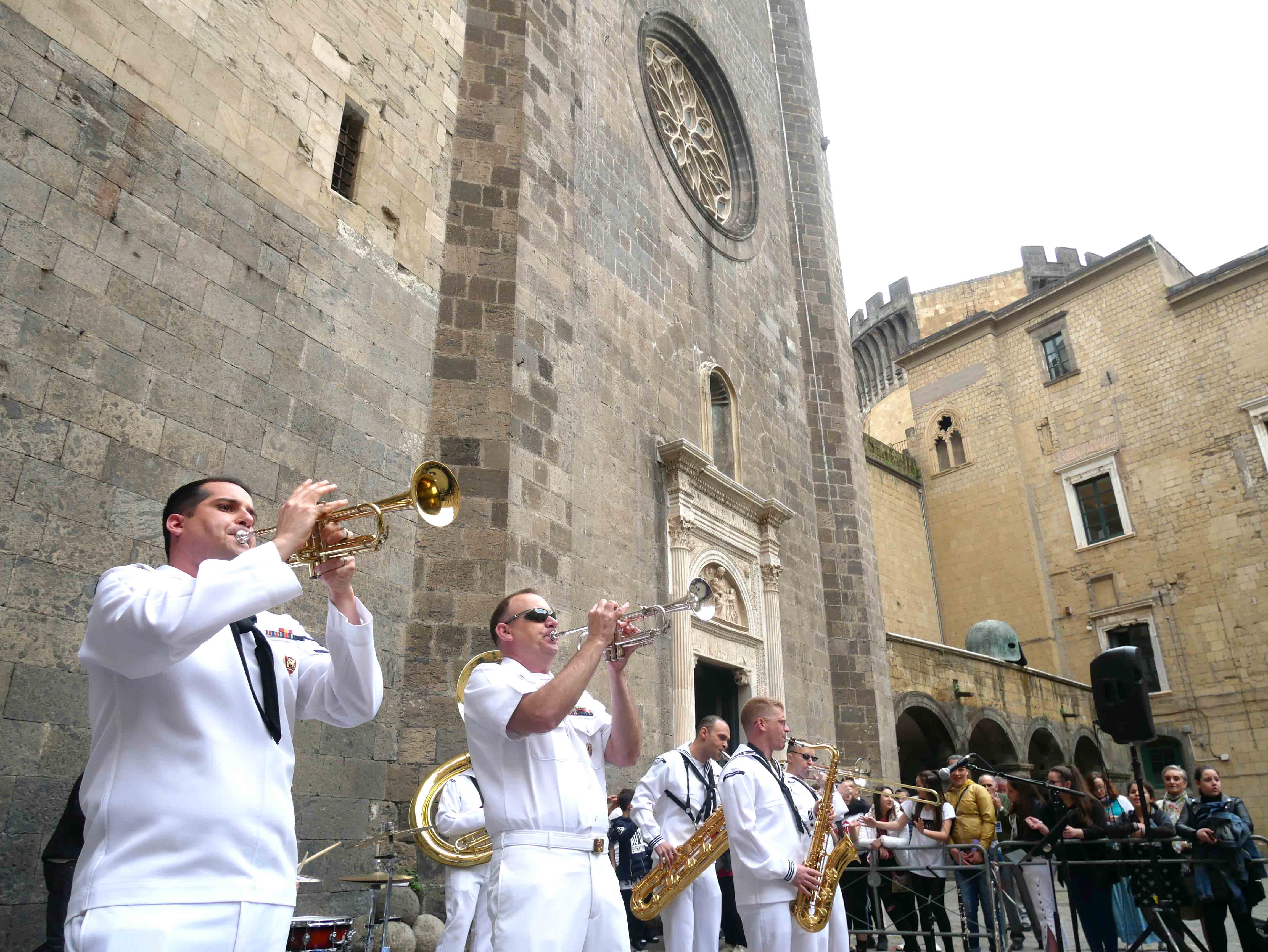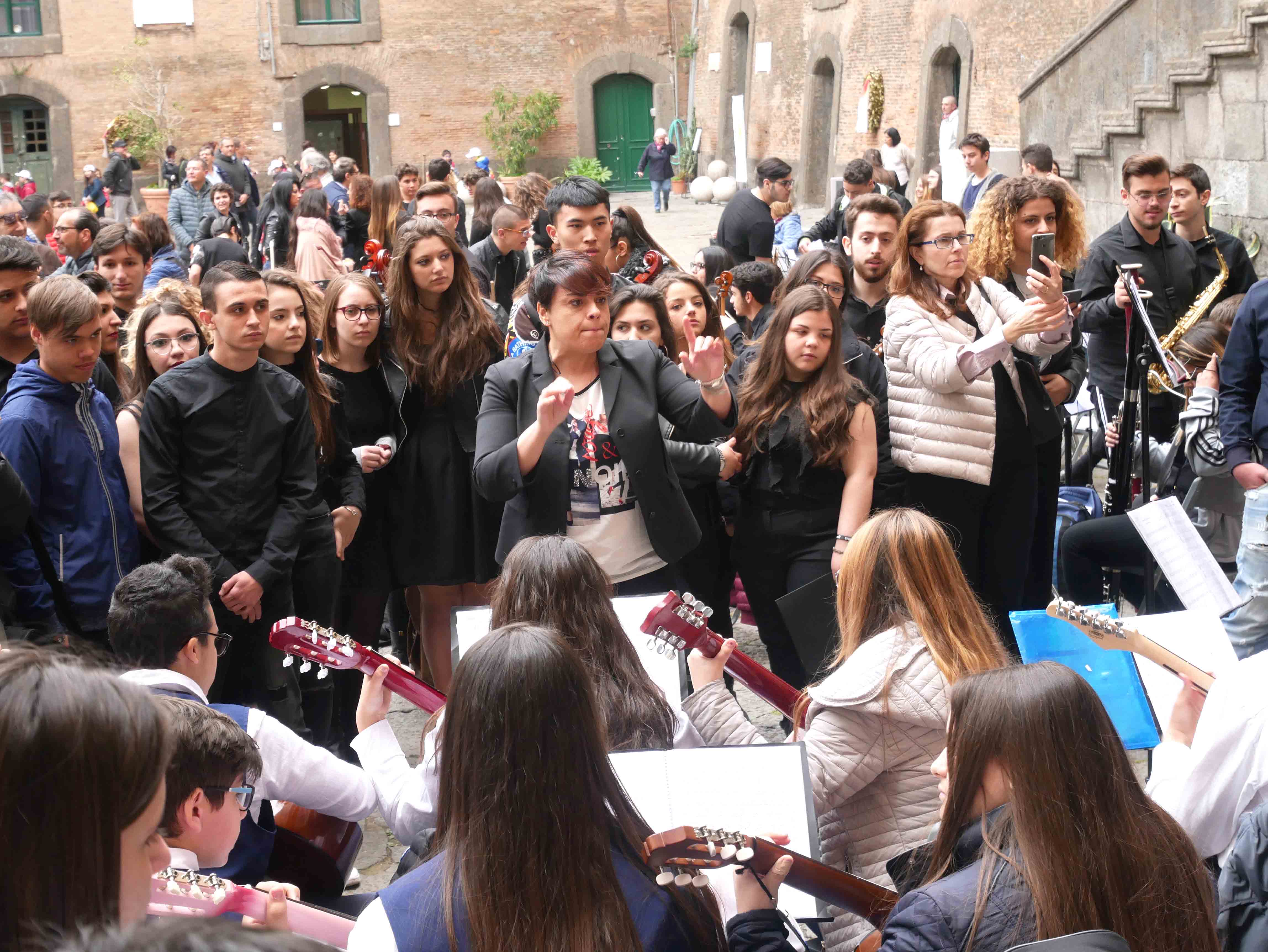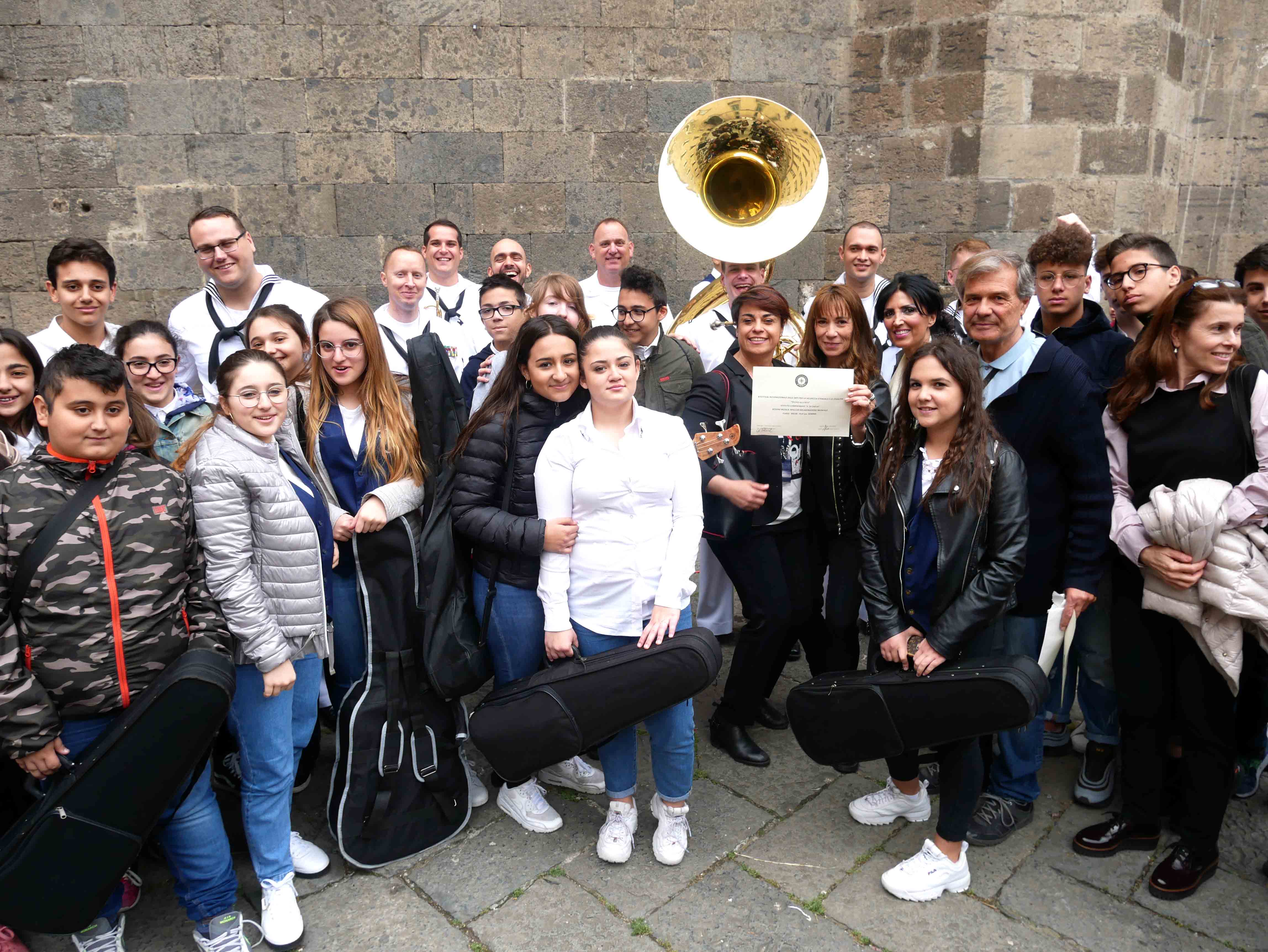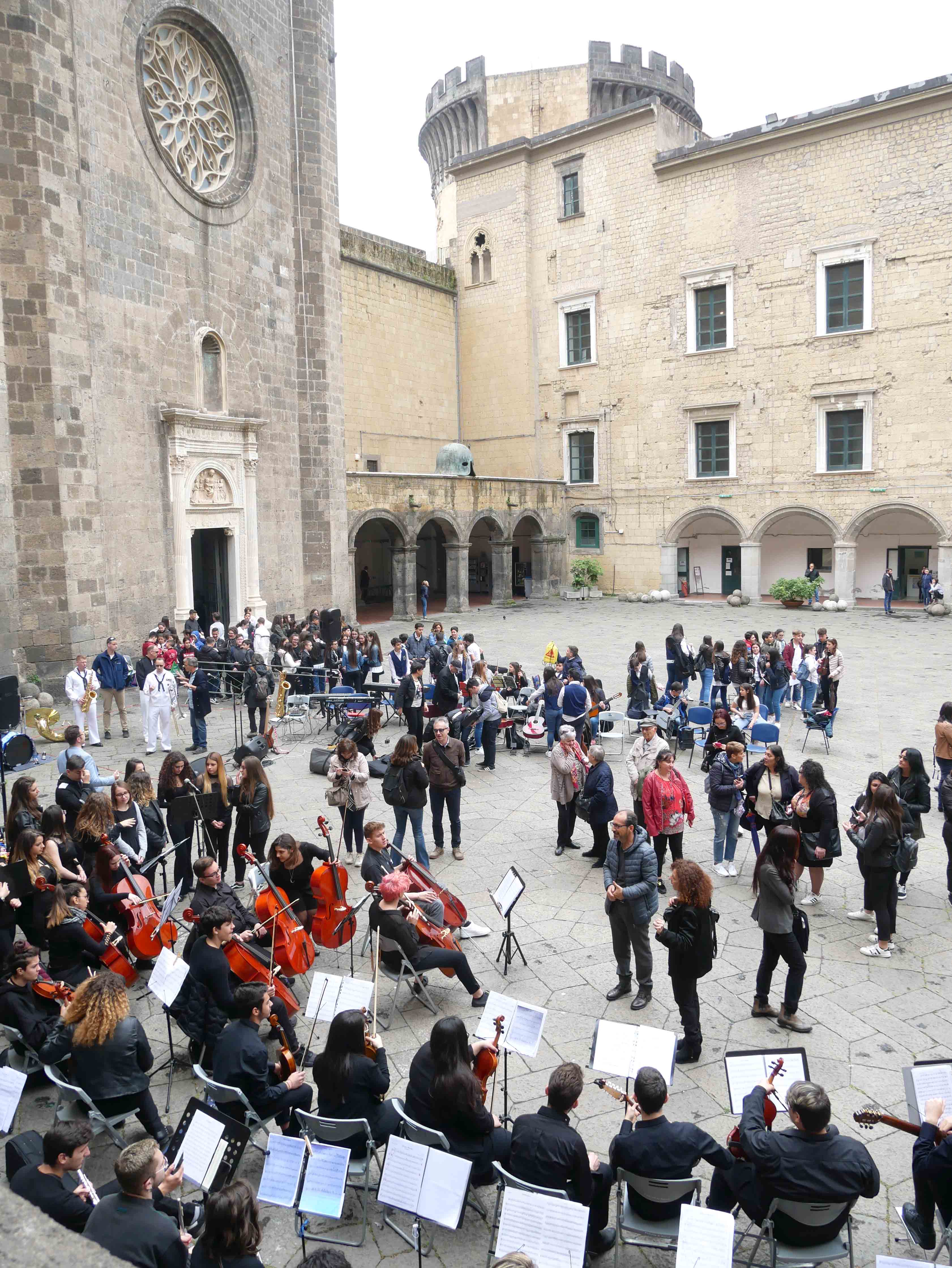 Si è svolto nel cortile del Maschio Angioino l’ottava edizione del “Festival internazionale delle arti per la sicurezza stradale e la legalità – Occhio alla vita”. Un’iniziativa promossa dall’ente del terzo settore “Etesia” che per tutto l’anno ha coinvolto una ventina di scuole, circa diecimila ragazzi, di ogni ordine e grado sul territorio di Napoli e provincia con tanti progetti teorici e pratici volti all’educazione civica. Il presidente di Etesia Antonio D’Ambrosio: “Durante l’anno tocchiamo temi importantissimi come la sicurezza stradale, il cyberbullismo, l’uso e abuso di sostanze stupefacenti, il corretto utilizzo di internet, e tutte quelle problematiche legate al disagio giovanile e alle devianze. Il tutto viene trattato attraverso l’arte per coinvolgere sia i ragazzi più piccoli che i grandi, con musica, balli, disegni, ma sono stati realizzati anche cortometraggi”. Al Maschio Angioino oggi erano presenti classi di quattro differenti scuole, Palizzi Boccioni, Scialoja Cortese, Di Capua, Dumas, che, accompagnate dalla banda musicale della Marina Militare degli Stati Uniti d’America, hanno presentato i loro progetti di fine anno. Le scuole partecipanti sono infatti italiane, francesi e americane. Alla fine delle esibizioni, gli stessi ragazzi hanno votato i progetti e sono stati premiati. Il cortile del Maschio Angioino si è animato quindi di tante musiche diverse, italiane, internazionali, napoletane, ed i ragazzi hanno suonato, cantato e ballato insieme ai militari della Marina. Da questa iniziativa partiranno corsi specifici di formazione con il coinvolgimenti di enti del terzo settore e anche dell’università Federico II di Napoli. “Ci siamo posti come obiettivo di allargare quest’iniziativa anche ad altre regioni italiane come il Molise e la Basilicata”, ha dichiarato il presidente di Etesia, D’Ambrosio.