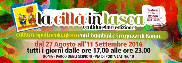ROMA – Sino all’11 settembre, tutti i giorni dalle 17 alle 23 torna con l’Estate Romana – al Parco degli Scipioni in via di Porta Latina, 10 – La città in tasca, cultura, spettacolo, gioco con i bambini e i ragazzi di Roma, organizzata dall’Arciragazzi Comitato di Roma e oggi alla Sua XXII edizione. La manifestazione è realizzata con il contributo di Roma Capitale, in collaborazione con la SIAE, è inserita nell’edizione 2016 dell’Estate Romana: “Roma, una Cultura Capitale”. L’appuntamento è riconosciuto come Festival di particolare interesse per la vita culturale della Città per il periodo 2014/2016. Un ricchissimo programma di teatro, musica, cinema, danza, laboratori, letture e tantissimi giochi, dedicato ai bambini dai 3 ai 12 anni, giunto alla 22esima edizione.